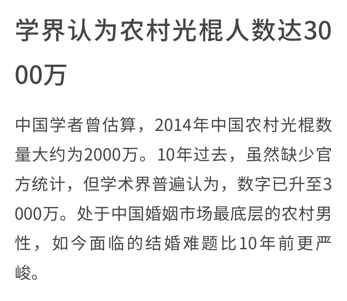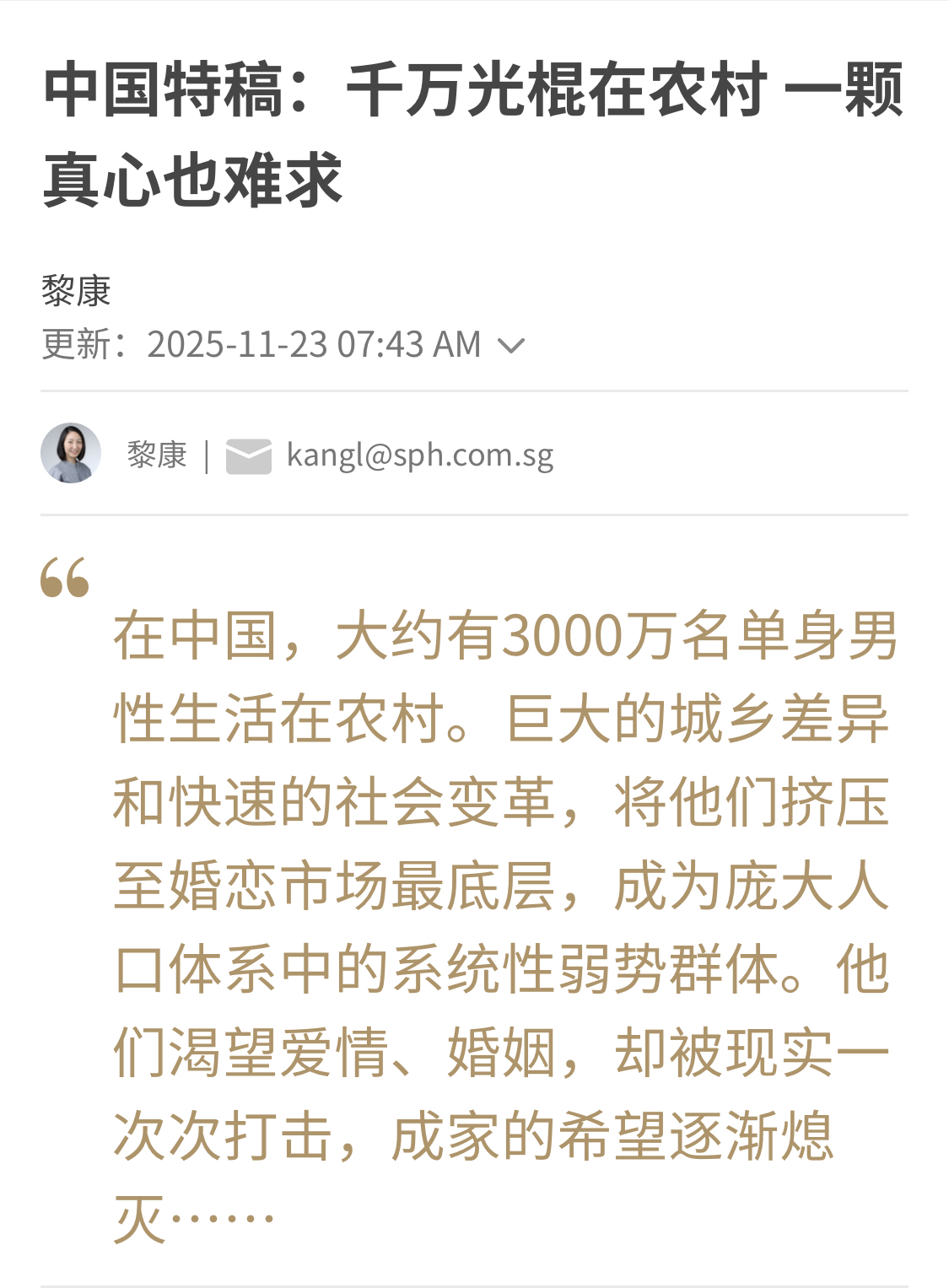 3000万男光棍在基层, 忧、悠之中慢慢过一生 《联合早报》今在报道 算是新时代里什么人?
