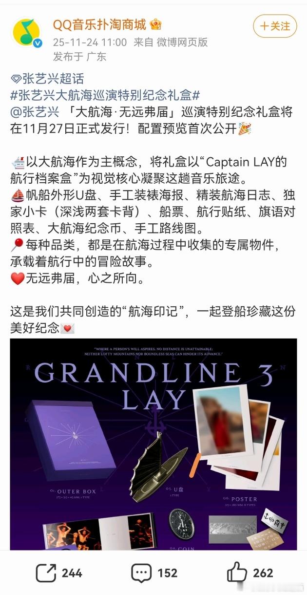 张艺兴 「大航海3·无远弗届」特别纪念礼盒来了!🛳以大航海作为主概念,将礼盒以“Captain LAY的航行档案盒”为视觉核心凝聚这趟音乐旅途。 ⛵帆船外形U盘、手工装裱海报、精装航海日志、独家小卡(深浅两套卡背)、船票、航行贴纸、旗语对照表、大航海纪念币、手工路线图。 大航海每一个舞台都值得珍藏👏🏻