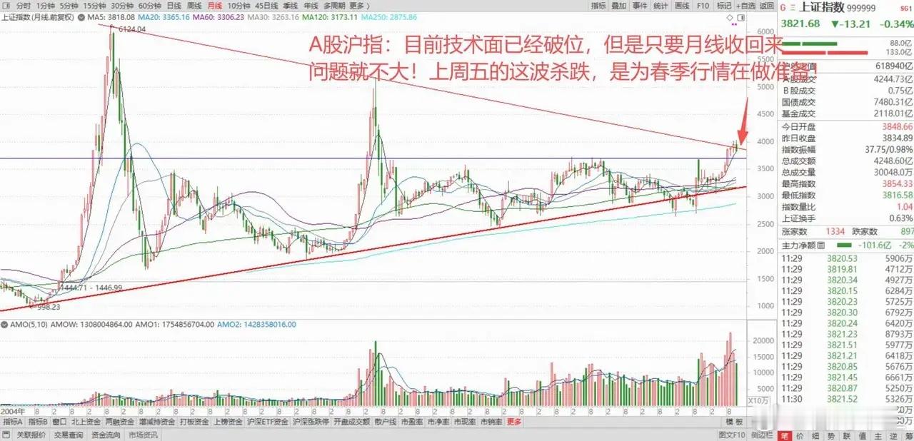 全球股市止跌回升,港股大反攻!A股2小时缩量2807亿,静待多头发动攻势! 1、美股周五止跌了! 由于近期美股带领全球科技股连续杀跌,当地时间11月21日美联储出来放鸽救市,让市场对于12月降息的概率预期提升到了70%上方,上周五美股三大指数终于止跌回升,连周四跌幅最狠的存储芯片方向都企稳上涨了。截止收盘,道指上涨1.08%、纳指上涨0.88%、标普500指数上涨0.95%。 2、中概股、欧洲和亚太股市企稳 受此影响,美股中概股也止跌回稳,纳斯达克中国金龙指数上涨1.23%;欧洲股市周五涨跌参半,没有跟跌亚太股市的暴跌,同样出现企稳现象。而今天亚太股市表现优秀,除了日本股市假期休市以外,韩国和澳大利亚股市止跌反攻,上午在涨幅1%附近震荡。 3、港股也大反攻了! 港股也跟随亚太股市走强,恒生指数早盘跳空高开0.92%,随后震荡上行,午间收盘上涨1.42%。而从10月3日至上周五,港股恒生科技指数下跌近20%,到今天终于遇年线企稳了!港股科技股今天也表现强势,恒生科技午间收盘上涨1.65%,网易和阿里巴巴大涨5.67%和4.13%。 4、A股逆势杀跌 上午A股的表现却极其反常和让人疑惑,没有跟涨任何一个市场,反而还在缩量弱势探底。上证指数早盘跳空高开0.36%以后,开盘就是最高点,随后震荡下行,午间收盘下跌0.34%,收在3821点。另外深证成指、创业板指、科创50指数同步下跌,跌幅分别为0.59%、0.77%、0.4%。 5、半天缩量2807亿 A股上午还有一个明显的特征,量能萎缩到极致,上午两市成交额仅1.02万亿,仅半天比周五上午缩量2807亿,如果下午不放量,预计全天也就在1.5万亿成交额附近。空头虽然仍在杀跌,但是下跌已经没量了,股民不愿意在这个时候交出筹码。多头蓄势待发,随时可能发动攻势。 综上所述,目前A股沪指在各个突破关键位上来说,已经是技术破位。但是从大方面和趋势来说,牛市格局不变,无非是洗盘的回踩深度和时间问题。已经止损出来的朋友,目前静待时机,何时收复关键位置,一定要及时入场。 市场的杀跌属于技术面的盘整和受全球股市的影响,情绪面的利空,并不存在基本面和消息面利空的影响。像这类情绪面的杀跌是最容易被市场修复的。