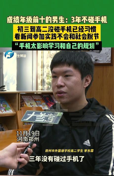 河南,一位高二男生火了!不是因为帅气的外表,也不是因为惊艳的才艺,而是他居然3年不碰手机,把成绩冲了年级前十,成了全网羡慕的自律学霸! 郑州市外国语学校的课间,总能看到一个和周围有些不一样的身影。   高二学生李东霖递出一张手写纸条,上面写着“周末图书馆捋错题,一起吗”,对面同学笑着点头。   当其他同学扎堆刷短视频、聊网络热梗时,他衣兜里揣着的,是一部只能接打电话的“砖头机”。   谁能想到,这个如今眼神清澈、做事专注的男生,抽屉里锁着一部智能手机,从初三暑假到现在,整整三年,他没主动解锁过一次。   家人当初只是顺着他的意思,把手机收进了抽屉最里层,没反对也没抱太高期望,没想到这个十几岁的孩子,真的把这份坚持扛了下来。   李东霖至今记得,初三时的自己有多离不开手机。   本来计划晚上写完作业再复习半小时,结果刚坐下就被社交软件的弹窗消息勾走了神,等回复完消息,又忍不住点开短视频刷“最后一条”,不知不觉就到了凌晨,卷子还剩半张没写。   物理小测时,屏幕突然亮起的游戏弹窗,能让他悬着的笔尖瞬间停滞,留下大片空白的试卷。   晚自习遇到力学难题想查资料,指尖一划就点开了短视频,等回过神来,半小时已经像流沙一样没了。   那些日子,他总陷入一种奇怪的循环,不知道该干什么就刷手机,刷完之后反而更空虚。   直到有天晚自习,他瞥见隔壁同学早就做完了大题,抽屉里的手机是一片死寂的黑色,人家全程没碰过一次。   那种对比太直观了,他突然明白,不是自己不够聪明,是原本该用来学习的专注力,被手机拆得支离破碎。   下定决心把手机放一边后,最开始的日子并不好熬。   课间同学们围着屏幕笑作一团,他插不上话,耳朵忍不住往那边凑,手指还会下意识去摸桌洞里原本放手机的地方,心里像有千万只蚂蚁在爬。   放学路上,大家都低头盯着手机看消息,他只能盯着路边的树影往前走,偶尔觉得有些孤单。   就连周末想查个学习资料,都得跑去书房用家里的电脑,还得提前跟爸妈说清楚用途。   为了填补这份空虚,他开始给自己找事做。   排队打饭的几分钟,别人在刷手机,他就在脑子里过数学题,走路去教学楼的路上,嘴里小声默背古诗。   他的错题本也变了模样,不再是潦草的一笔带过,而是用红蓝黑三色笔,清清楚楚标注着知识盲区和解题思路。   慢慢的,变化在他身上悄悄发生,每天凭空多出来两个小时的整块时间,足够他把数学错题再捋三遍,把英语单词多背一轮。 成绩也一点点往上走,从中游慢慢稳定到年级前十,还拿下过全国物理竞赛二等奖。   身边的同学发现,李东霖并没有因为不碰手机就变得孤僻。   他会在课间和大家讨论报纸上看到的时事新闻,分享周末去社区整理图书的趣事,或者聊博物馆志愿讲解时遇到的有意思的观众。   他和朋友的约定,不是靠线上聊天敲定,而是一张张小纸条,字里行间带着温度,反而比隔着屏幕的对话更显真诚。   后来,他还拉着班里几个成绩起伏大的同学,组建了“无手机学习小组”,每天放学后的40分钟,大家聚在一起互助讲题,效率高得惊人。   现在的李东霖,睡眠质量比以前好了很多,情绪也更平稳,不会再被网上乱七八糟的信息搞得焦虑。   周末他要么泡在图书馆读报,要么参与社区志愿活动,偶尔也会羡慕同学能随时跟家人发消息,但摸了摸抽屉里写满笔记的错题本,又觉得这点不方便根本不算什么。   网上有人说他“太极端”,但他从来没往心里去。   对他来说,不碰手机不是要和科技对着干,也不是想当别人眼里的“学霸样本”,只是想摆脱惰性和诱惑,把精力放在自己真正想做的事情上。   科技课上,他照样能熟练使用电脑查资料、帮老师整理在线题库,他分得清手机的“工具”和“玩具”属性,只是选择在该奋斗的年纪,把干扰降到最低。   三年时间,李东霖用行动证明,少了手机的打扰,青春反而能过得更饱满。   那些别人刷视频被偷走的时间,他都变成了实打实的知识积累,变成了更健康的生活状态,变成了和同学之间更温暖的联结。   他的经历里,没有什么惊天动地的壮举,只有日复一日的坚持,和在诱惑面前守住本心的笃定。   这种踏实往前走的样子,或许就是成长最好的模样。