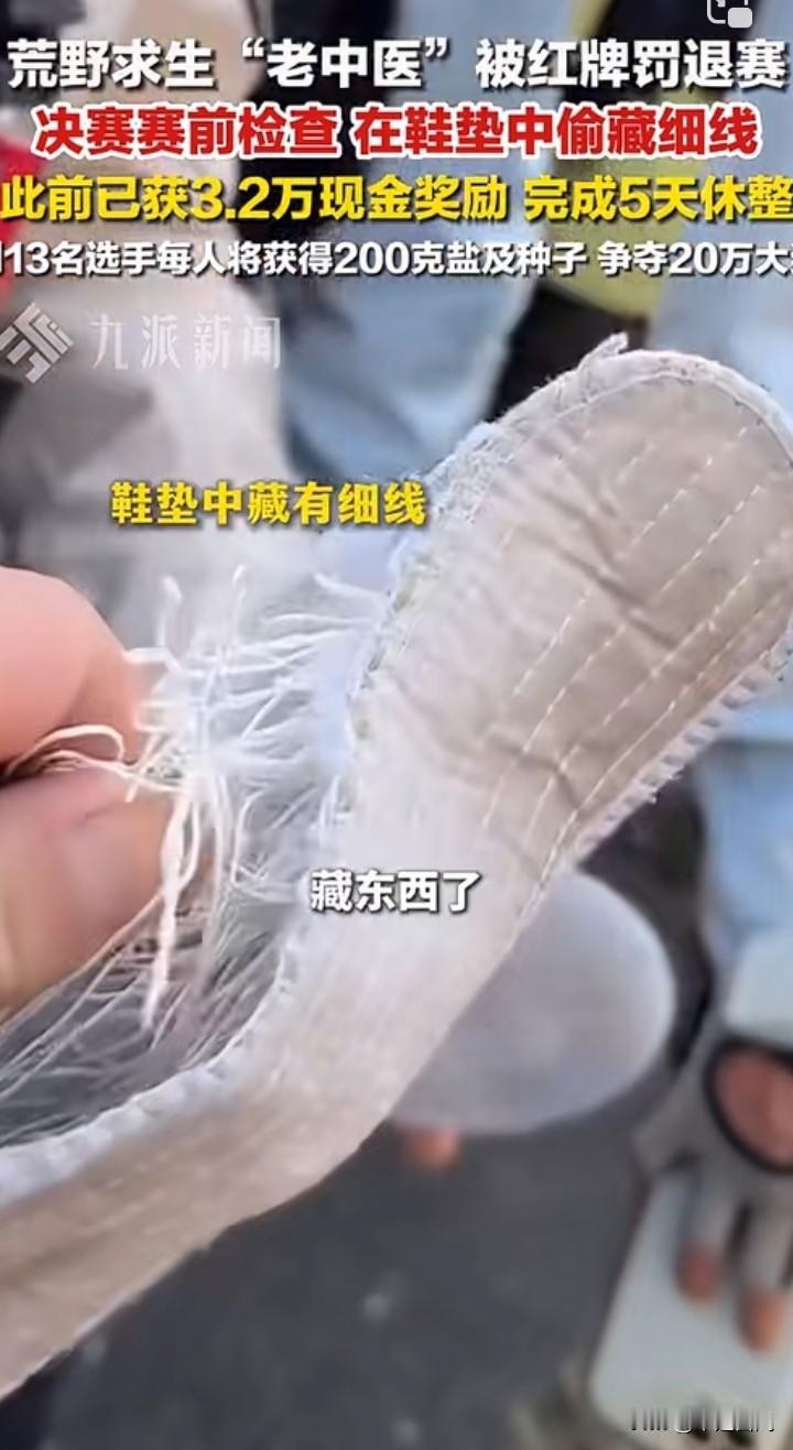 偷带细线有啥用? “完了完了,老中医红温了!红牌罚下! 太尴尬了! 老中医当场表示:我不带进去就行了 举办方:你现在讲这些都没用,夹带就是夹带,赛前我们已经三令五申了,不准夹带任何物品! 11月24日, 荒野求生老中医夹带细线被红牌退赛,此前已获3.2万现金奖励,剩13名选手争夺20万大奖。 我猜可以用来绑扎搭个窝,也可以做个网来捕鱼捕鸟,可以做个钻来钻木取火!还有吗?
