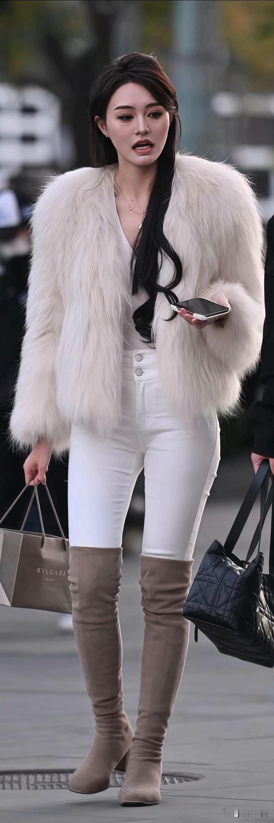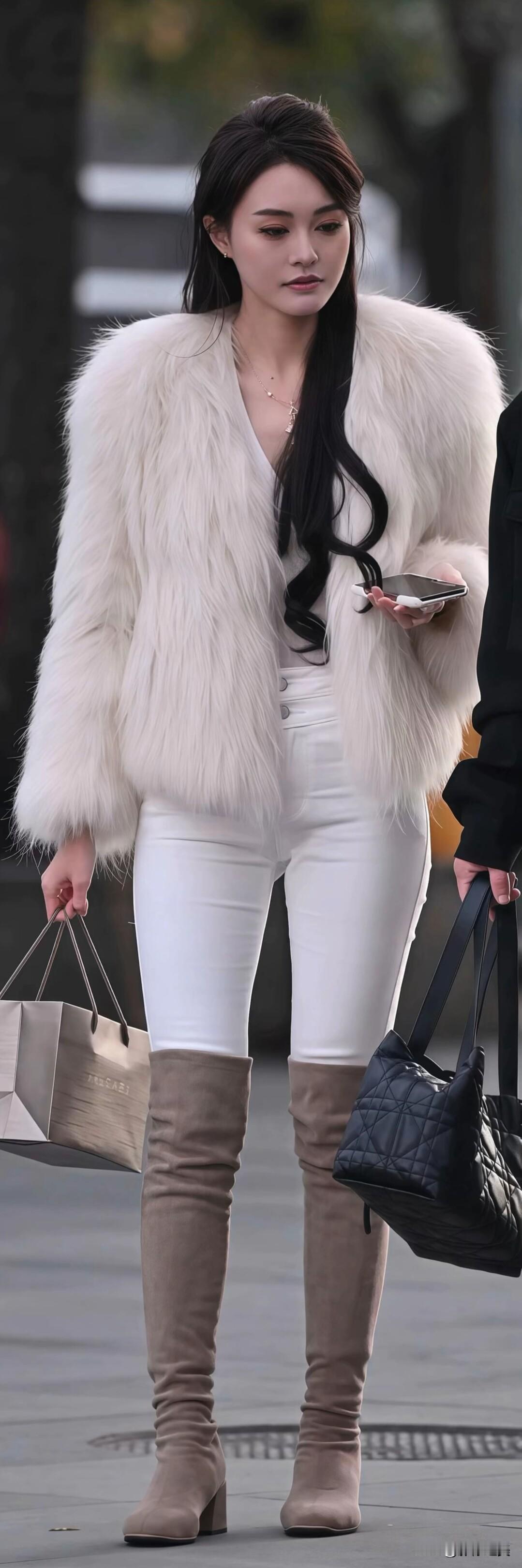 奶白色毛绒外套配白裤+卡其过膝靴,贵气又利落,冬日氛围感直接拉满~