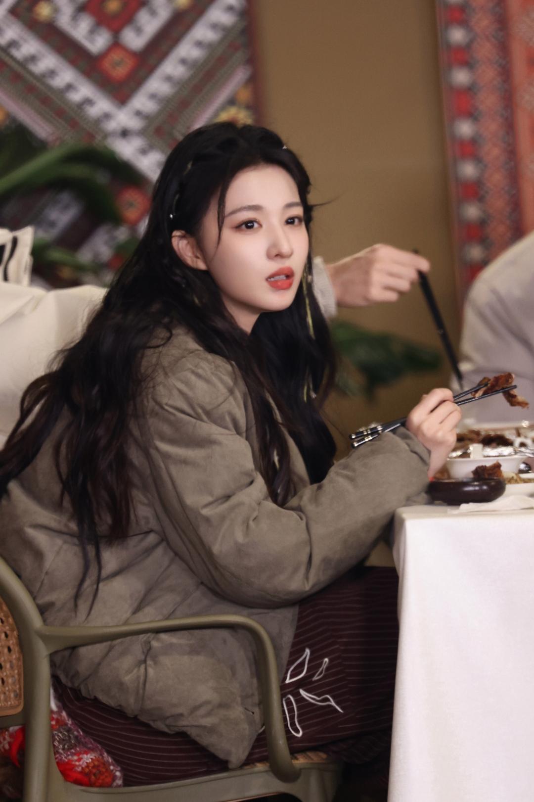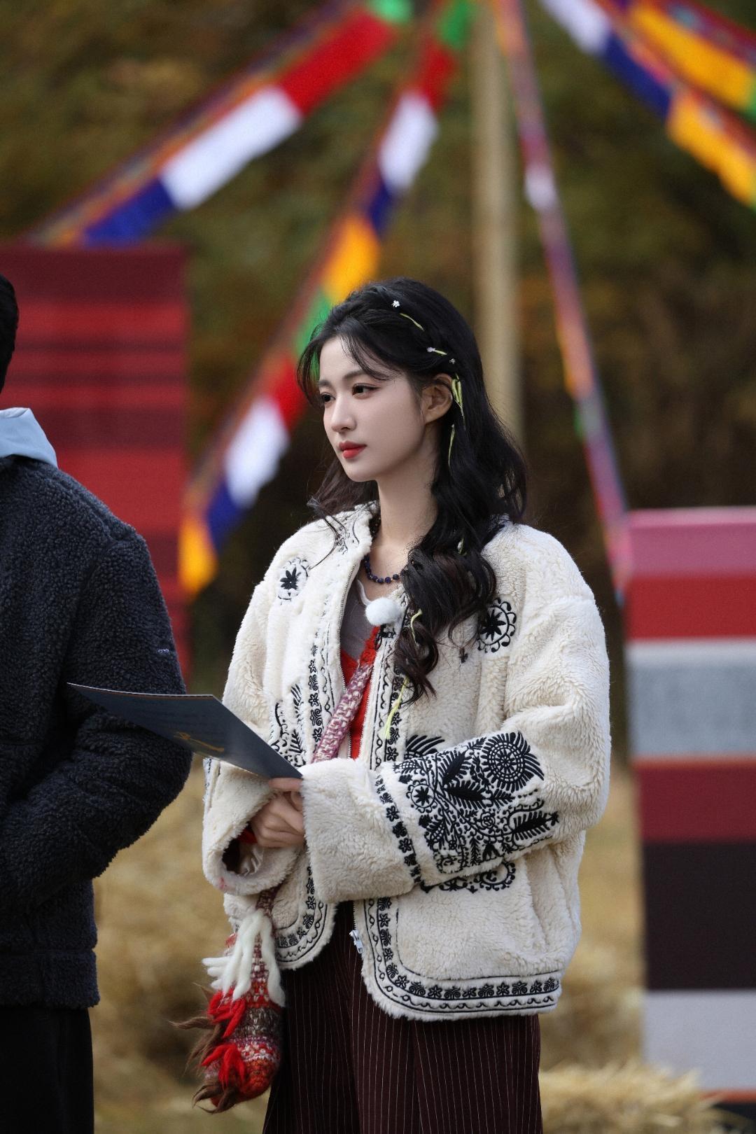 王楚然镜头里的她裹着奶乎乎的毛绒外套,黑纹刺绣裹满民族风细节,发间飘着嫩黄色编绳,连耳侧的小发夹都透着娇憨——这哪是赶路,明明是把秋日温柔揣进了藏区的风里