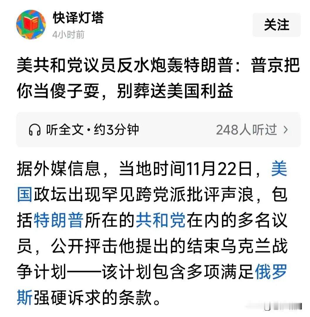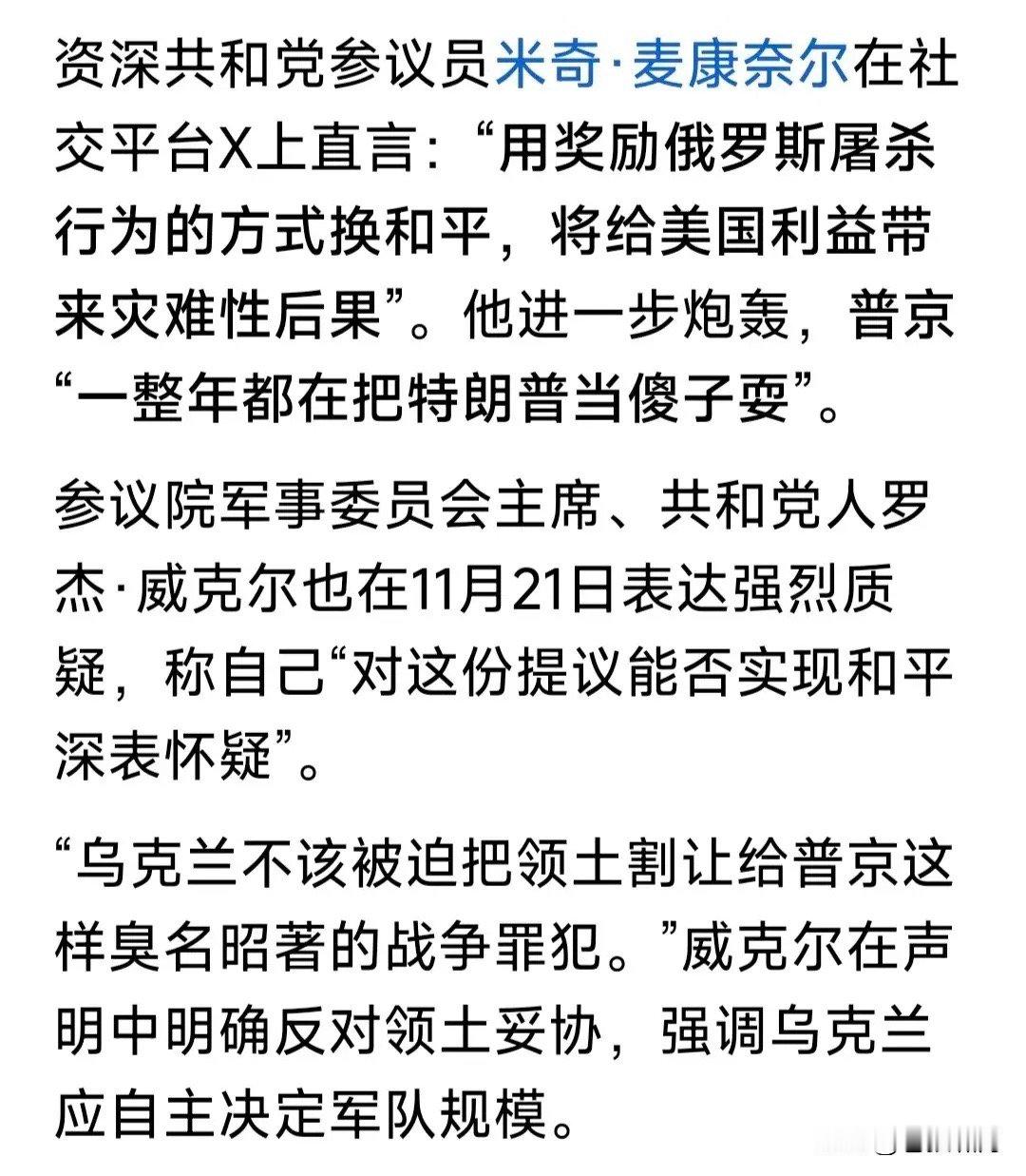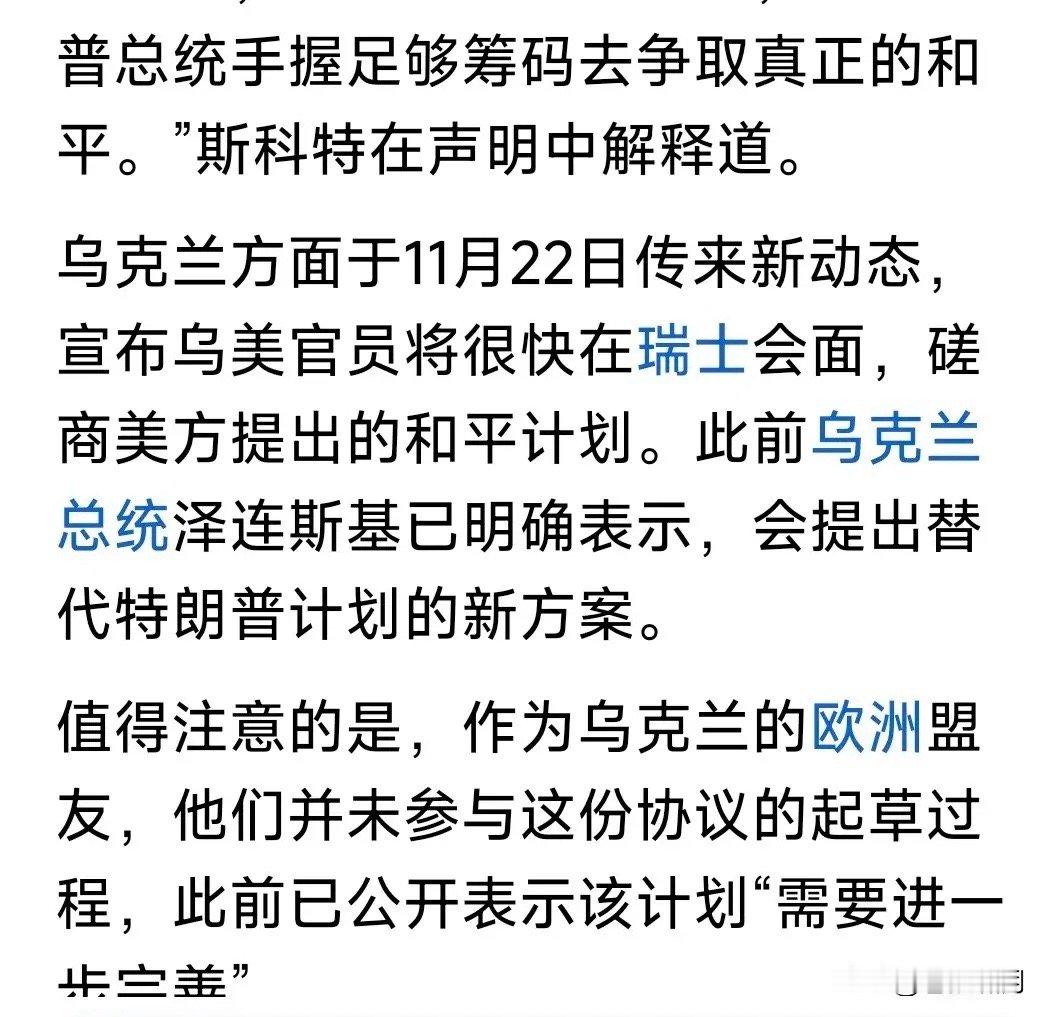 转个友友文老川的反噬来了目前美国务卿和陆军部长,正在瑞士同乌欧同盟会谈,据悉在“28条”基础上,又推出“24条”,主要不同点是:1.肯定美国为和平做出的努力。2.俄乌停战要以实控线为基础。3.乌主权是国际法界定不容质疑。4.军队数量由本国决定不能强迫。5.俄乌停战后欧洲应派监督部队。6.美欧设立乌重建基金开始运行。一切迹象表明,老特“28条”已流产,新“24条”在形成。随后如何定型?要看各方博弈。短期看战争难结束,川普日子难过!俄乌美欧还需要煎熬啊!