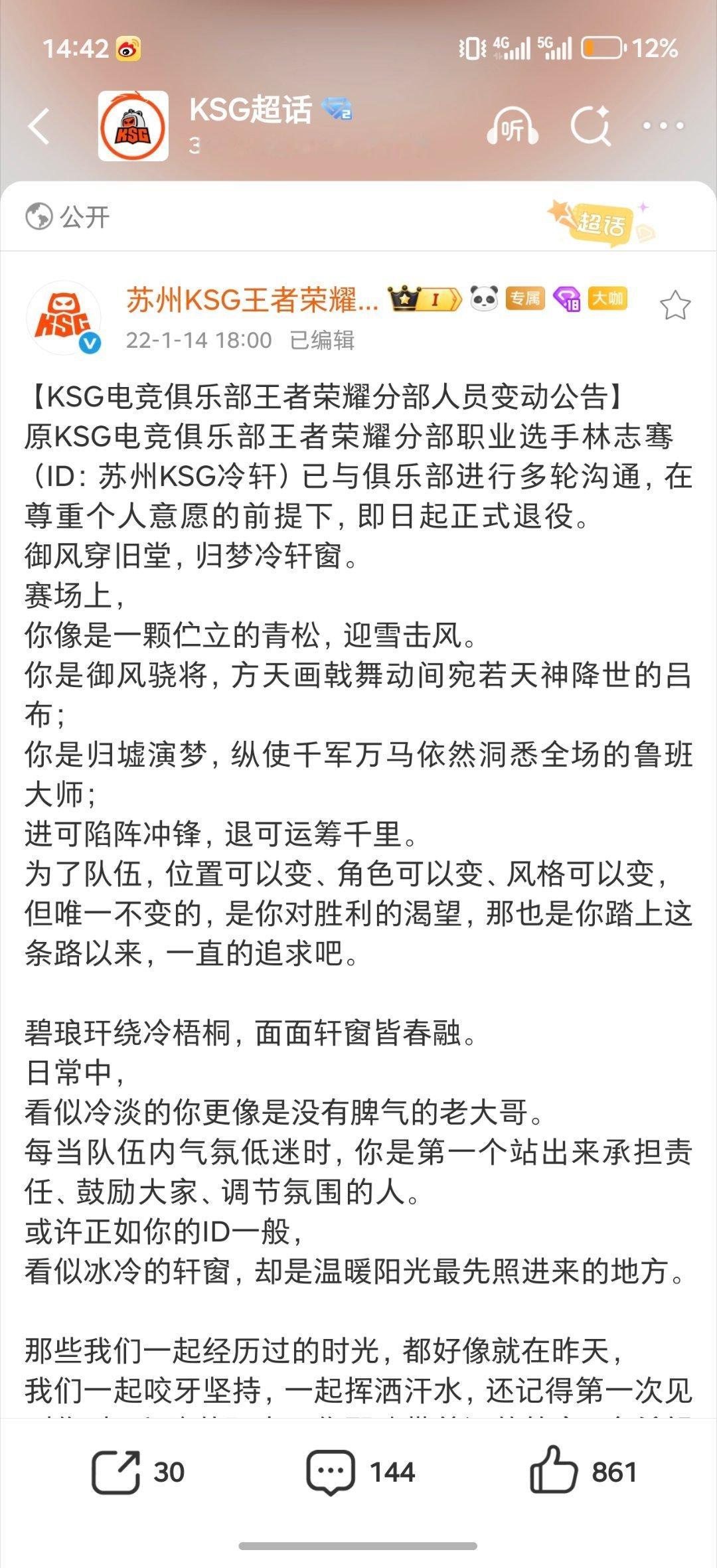 KSG把22年退役的冷轩又拉回来放在大名单里...