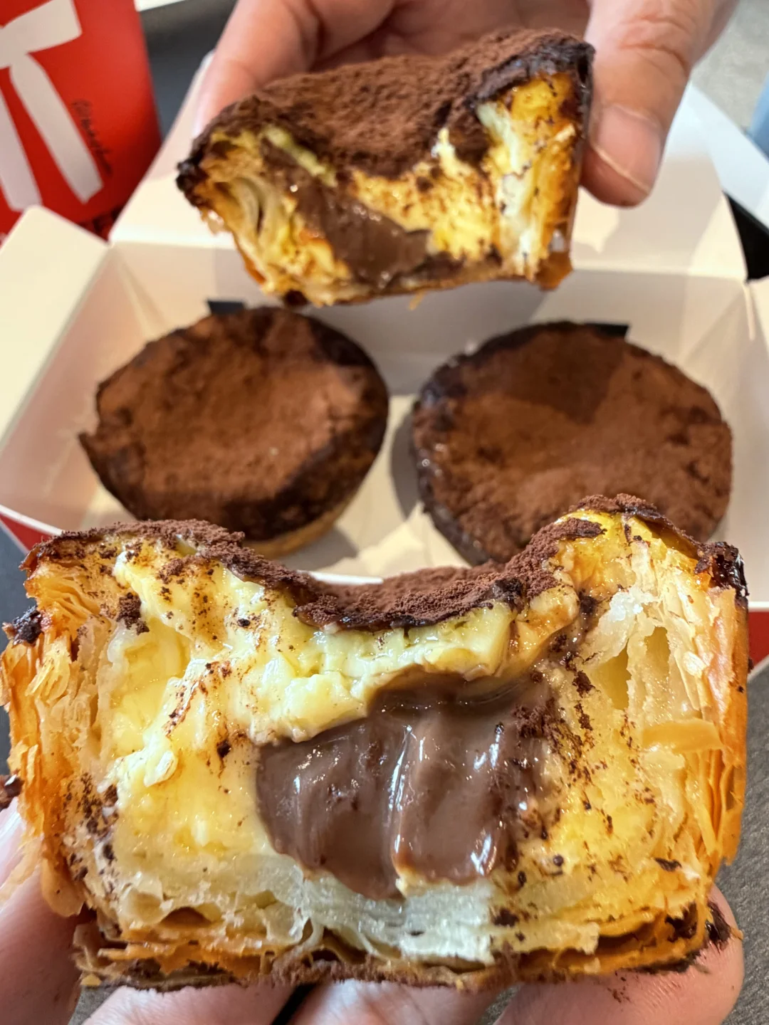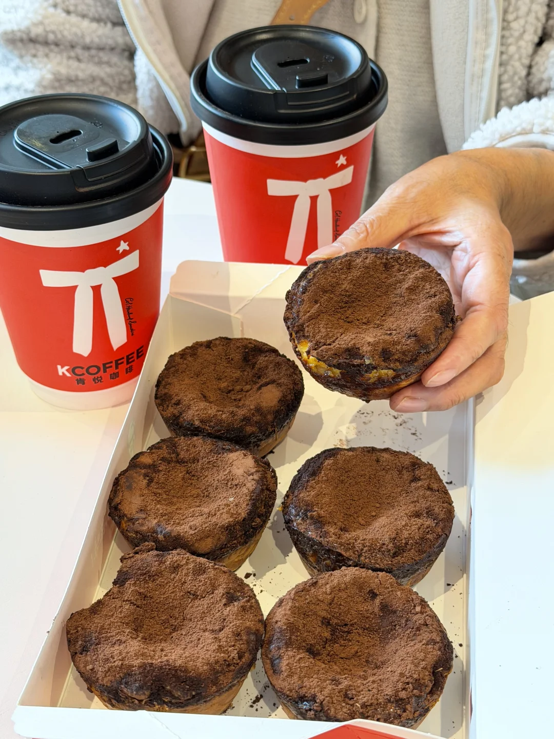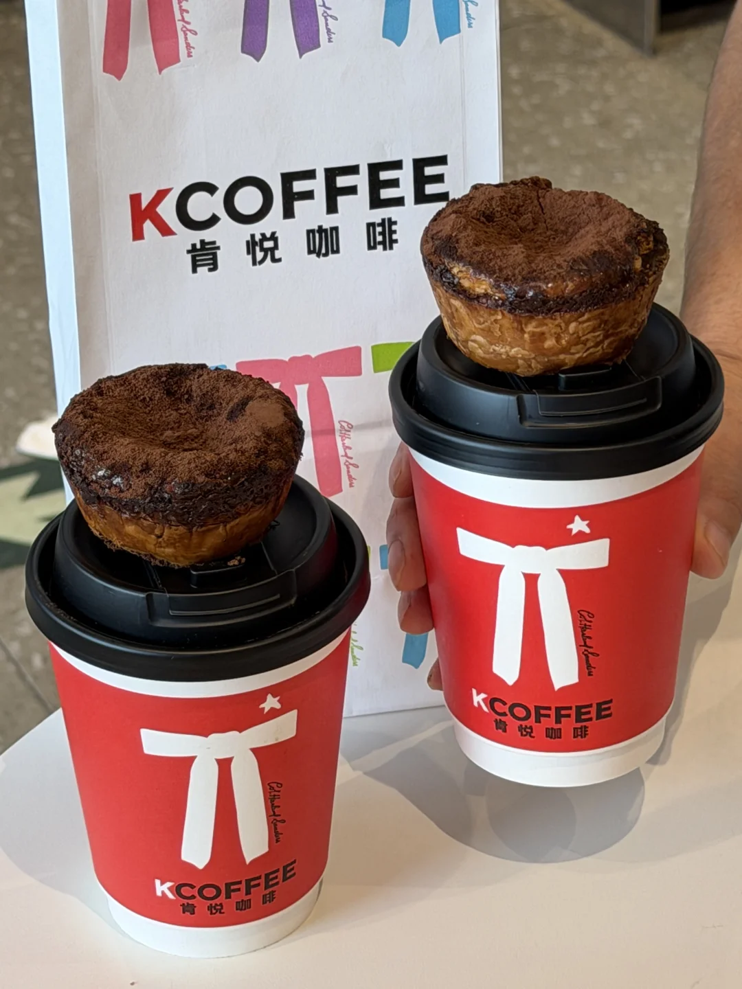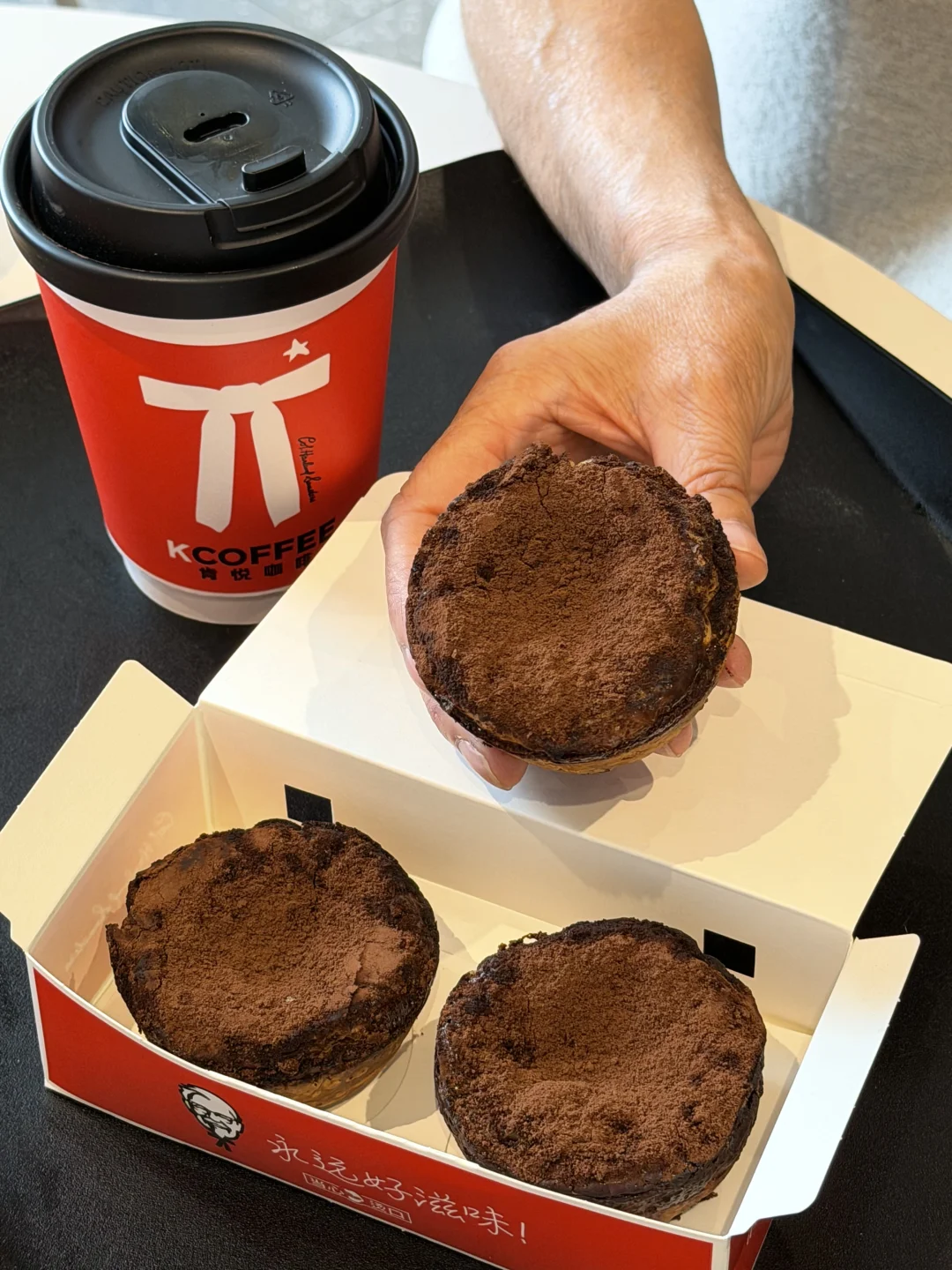 蛋挞界来了个天才。。。 我宣布!真正的极品:榛子黑巧风味厚蛋挞!! 肯悦的背后肯定是受了高人指点!!!再冷漠的人吃到这一口也会笑出声。。。 外面撒满可可粉 里面是满满的榛子黑巧内馅 咬下去的时候,挞皮tree tree的!! 先是一口满满的巧克力,入口浓郁的蛋挞奶香和醇厚的巧克力绝妙融合~ 一点都不齁甜一口沦陷,好吃s了 最馋的时候,一天吃了六个!! 再配上一杯红苹果热美式,一口蛋挞一口咖啡当下午茶好幸福/ᐠ .⸝⸝⸝. ྀིマ 蛋挞和咖啡两件套只要14.9r起,好划算的。