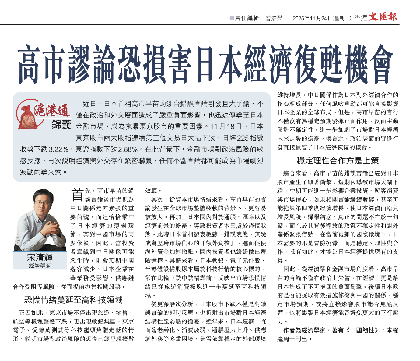 #沪港通锦囊# 高市谬论恐损害日本经济复苏机会。作者系经济学家宋清辉,全文部分内容摘录如下:近日,日本首相高市早苗的涉台错误言论引发巨大争议,不仅在政治和外交层面造成了严重负面影响,也迅速传导至日本金融市场,成为拖累东京股市的重要因素。11月18日,日本东京股市两大股指连续第三个交易日大幅下跌,日经225指数收盘下跌3.22%,东证指数下跌2.88%。在此背景下,金融市场对政治风险的敏感反应,再次说明经济与外交存在紧密联系,任何不当言论都可能成为市场剧烈波动的导火索。