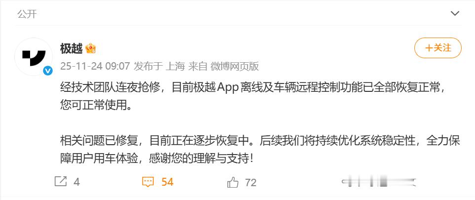 【极越汽车:App 离线及车辆远程控制功能已全部恢复正常】IT之家 11 月 24 日消息,11 月 23 日晚 22 时许,多位极越车主反馈,极越汽车出现突发网络故障,手机 App 端显示车辆处于“离线”状态,导致用户无法使用远程控制等关键功能。当晚,极越汽车官微回应称,技术团队已第一时间启动应急响应机制,全力进行问题排查与修复工作。随后在今天上午 9 时左右,极越汽车方面再次回应称,经技术团队连夜抢修,目前极越 App 离线及车辆远程控制功能已全部恢复正常,可正常使用。“相关问题已修复,后续我们将持续优化系统稳定性,全力保障用户用车体验。”据IT之家了解,极越汽车今年 7 月公布的《关于极越车机软件服务及车辆售后质保范围》公告提到,通过极越汽车正常销售渠道销售的车辆,可享受正常车机服务,保障车机系统稳定运行,同时可按照国家相关法律法规享受车辆质保服务。通过极越汽车授权销售渠道销售的车辆,极越仅提供车机软件服务,售后服务由销售方提供。(IT之家)
