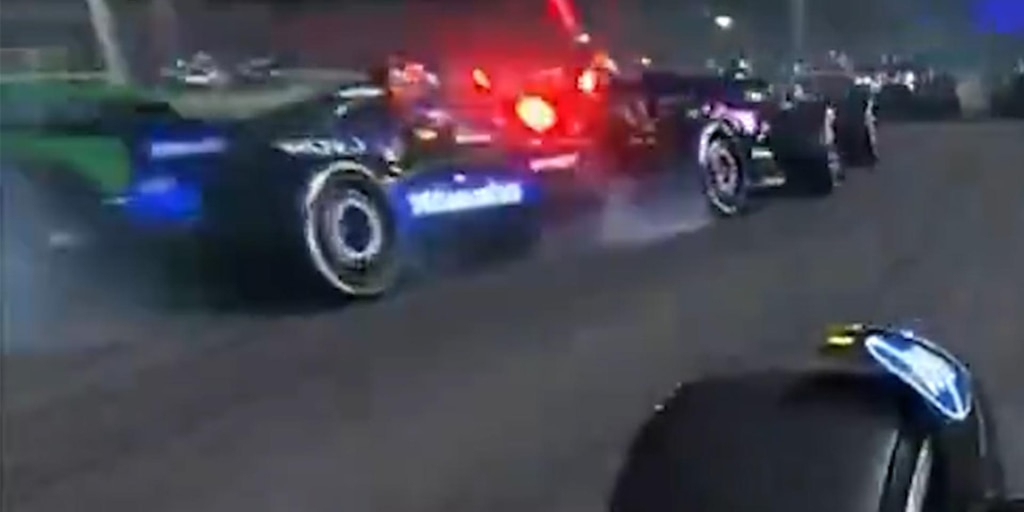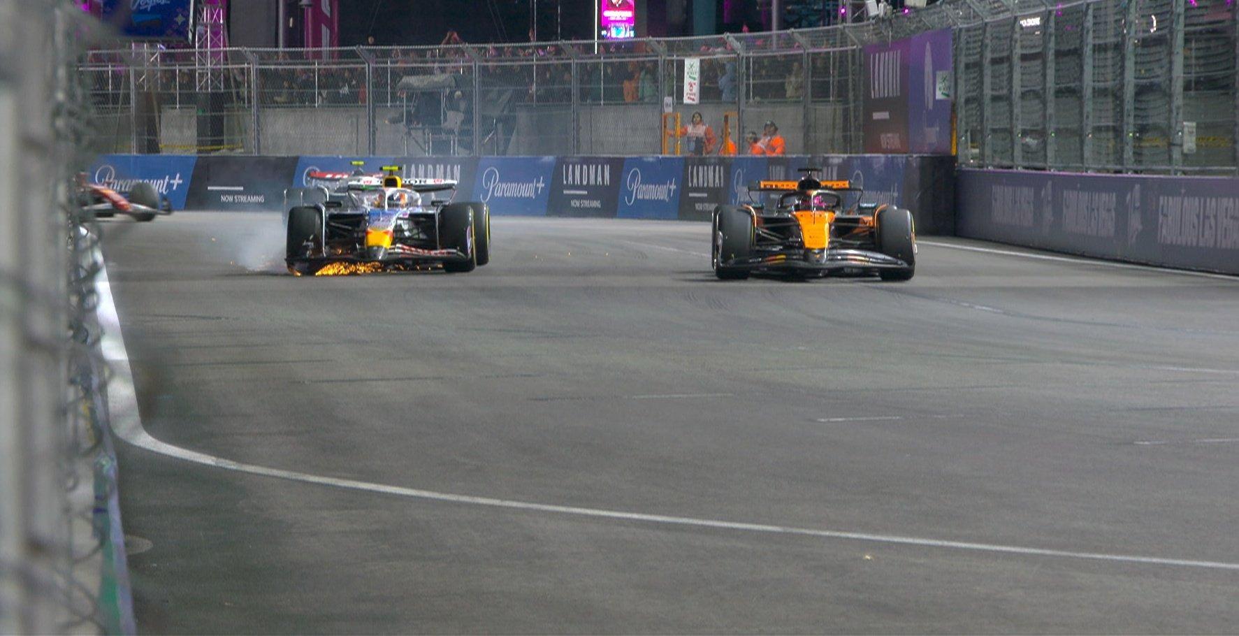 拉斯维加斯大奖赛,4支带来特别款涂装的车队全部遭遇车损图1:阿尔本和汉密尔顿撞墙图2:博托莱托1号弯事故图3:劳森前翼受损图4:科拉平托被阿尔本追尾,赛车受损