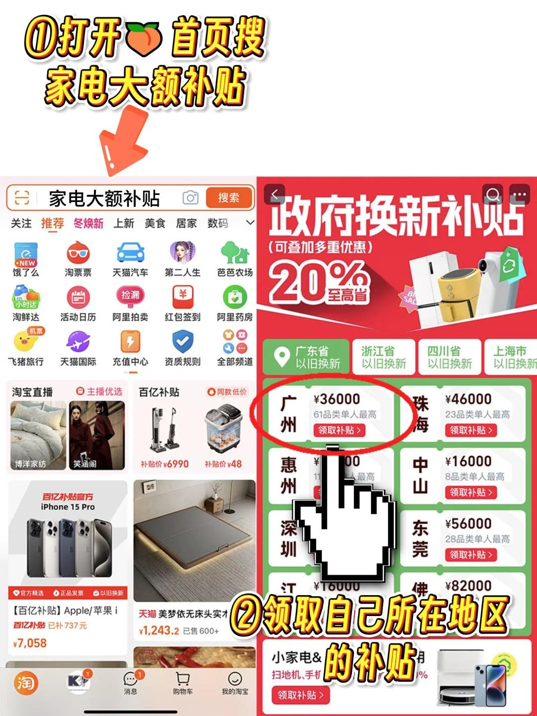 方法一:打开🍑首页搜-家电⼤额补贴-选择所在的地区-领取补贴