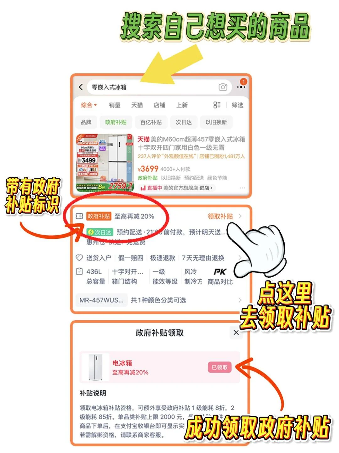 方法二:也可以在🍑搜索想要买的家电。只要带有政府补贴标识,都可以点进去领取补贴