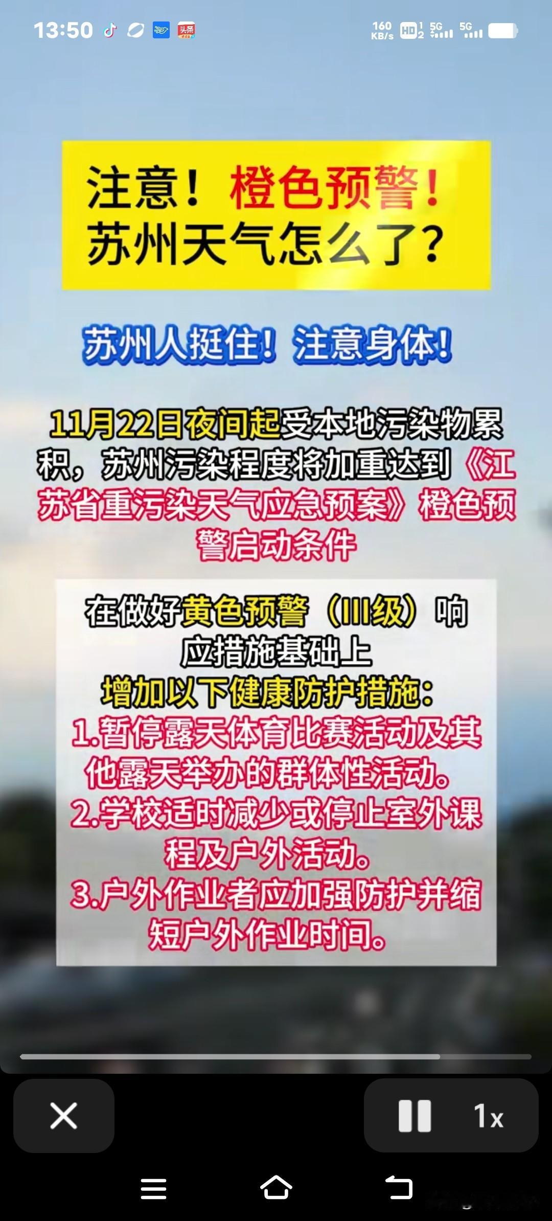 刚刚,苏州发布了橙色预警!空气质量污染程度提高,这些事现在千万别做! 苏州的朋友们,快注意啦!市生态环境局刚发了紧急通知,重污染天气预警直接升级到橙色级别。从今天下午4点起,整个苏州都要进入紧急的空气污染防御状态了。 像露天的体育比赛、学校组织的户外体育课、课间操这些,都得暂时停了。更严格的是,国四排放标准以下的货车,现在开始全部不能上路;还有烧汽油、柴油的工程车、机械车,也得全部停下来干活。连那些码头、堆场里的砂石运输,也都要暂时停运,这次看来是真的要下大力气治理了! 专家分析,这次的污染问题,是本地排放和上游地区污染物输送“一起发力”导致的。他们建议,上班的朋友尽量选公交、地铁这种公共交通出门,各单位也最好让大家错峰上下班,实行弹性工作制。不过也有网友开玩笑说:“这下好了,中午不用纠结吃啥了,直接吃‘土’体验生活!” 大家觉得这样的应急措施,能帮苏州的空气“洗个澡”吗?你所在的城市遇到重污染天,还会有哪些特别的防护办法呢?