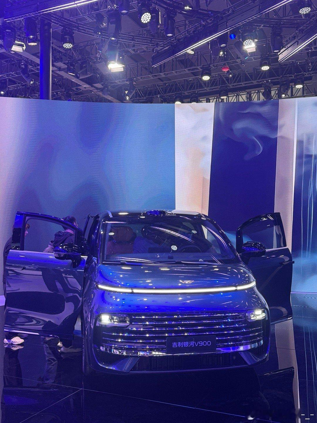吉利银河V900全球首秀!深蓝色车身配贯穿式灯带,展台蓝调灯光一衬质真的拉满。