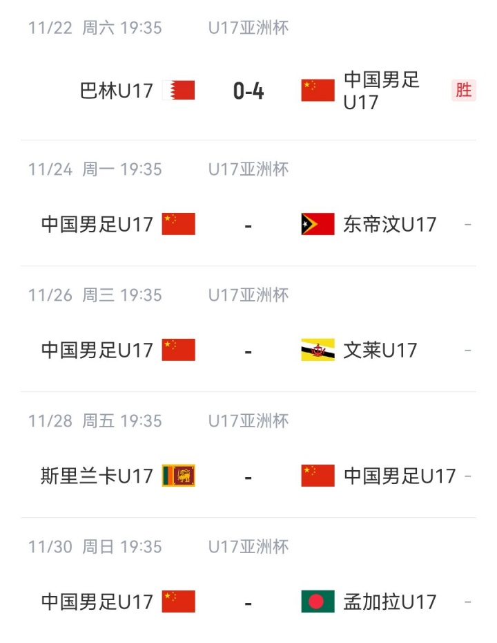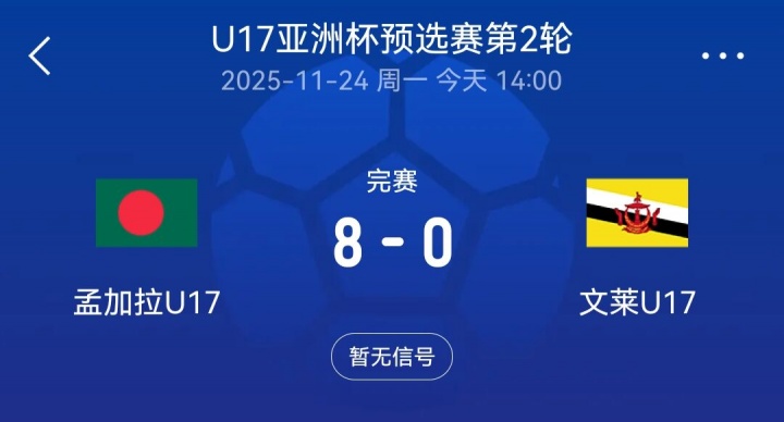 直播吧11月24日讯在刚结束的一场U17亚洲杯预选赛中,孟加拉U178-0大胜文莱U17,这两支球队是国少的同组对手,目前孟加拉U17两战全胜进13球丢0球。