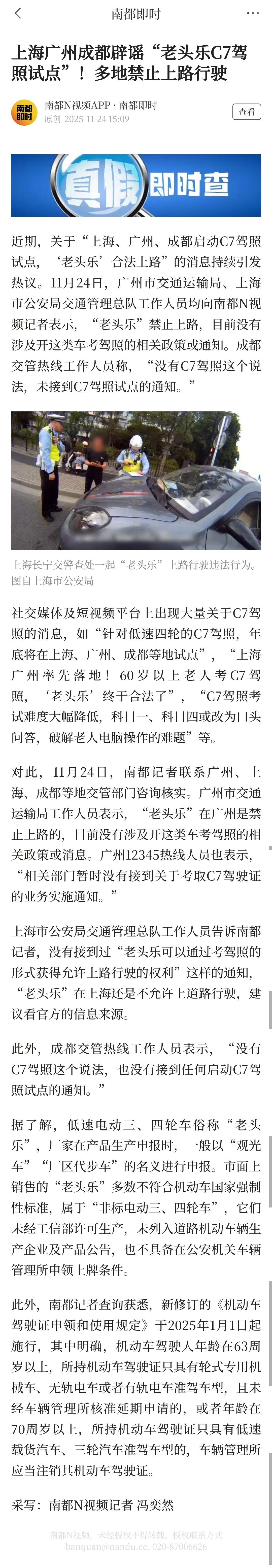 【上海广州成都辟谣“老头乐C7驾照试点”!多地禁止上路行驶】近期,关于“上海、广州、成都启动C7驾照试点,‘老头乐’合法上路”的消息持续引发热议。11月24日,广州市交通运输局、上海市公安局交通管理总队工作人员均向南都N视频记者表示,“老头乐”禁止上路,目前没有涉及开这类车考驾照的相关政策或通知。成都交管热线工作人员称,“没有C7驾照这个说法,未接到C7驾照试点的通知。”社交媒体及短视频平台上出现大量关于C7驾照的消息,如“针对低速四轮的C7驾照,年底将在上海、广州、成都等地试点”,“上海广州率先落地!60岁以上老人考C7驾照,‘老头乐’终于合法了”,“C7驾照考试难度大幅降低,科目一、科目四或改为口头问答,破解老人电脑操作的难题”等。对此,11月24日,南都记者联系广州、上海、成都等地交管部门咨询核实。广州市交通运输局工作人员表示,“老头乐”在广州是禁止上路的,目前没有涉及开这类车考驾照的相关政策或消息。广州12345热线人员也表示,“相关部门暂时没有接到关于考取C7驾驶证的业务实施通知。”上海市公安局交通管理总队工作人员告诉南都记者,没有接到过“老头乐可以通过考驾照的形式获得允许上路行驶的权利”这样的通知,“老头乐”在上海还是不允许上道路行驶,建议看官方的信息来源。此外,成都交管热线工作人员表示,“没有C7驾照这个说法,也没有接到任何启动C7驾照试点的通知。”据了解,低速电动三、四轮车俗称“老头乐”,厂家在产品生产申报时,一般以“观光车”“厂区代步车”的名义进行申报。市面上销售的“老头乐”多数不符合机动车国家强制性标准,属于“非标电动三、四轮车”,它们未经工信部许可生产,未列入道路机动车辆生产企业及产品公告,也不具备在公安机关车辆管理所申领上牌条件。