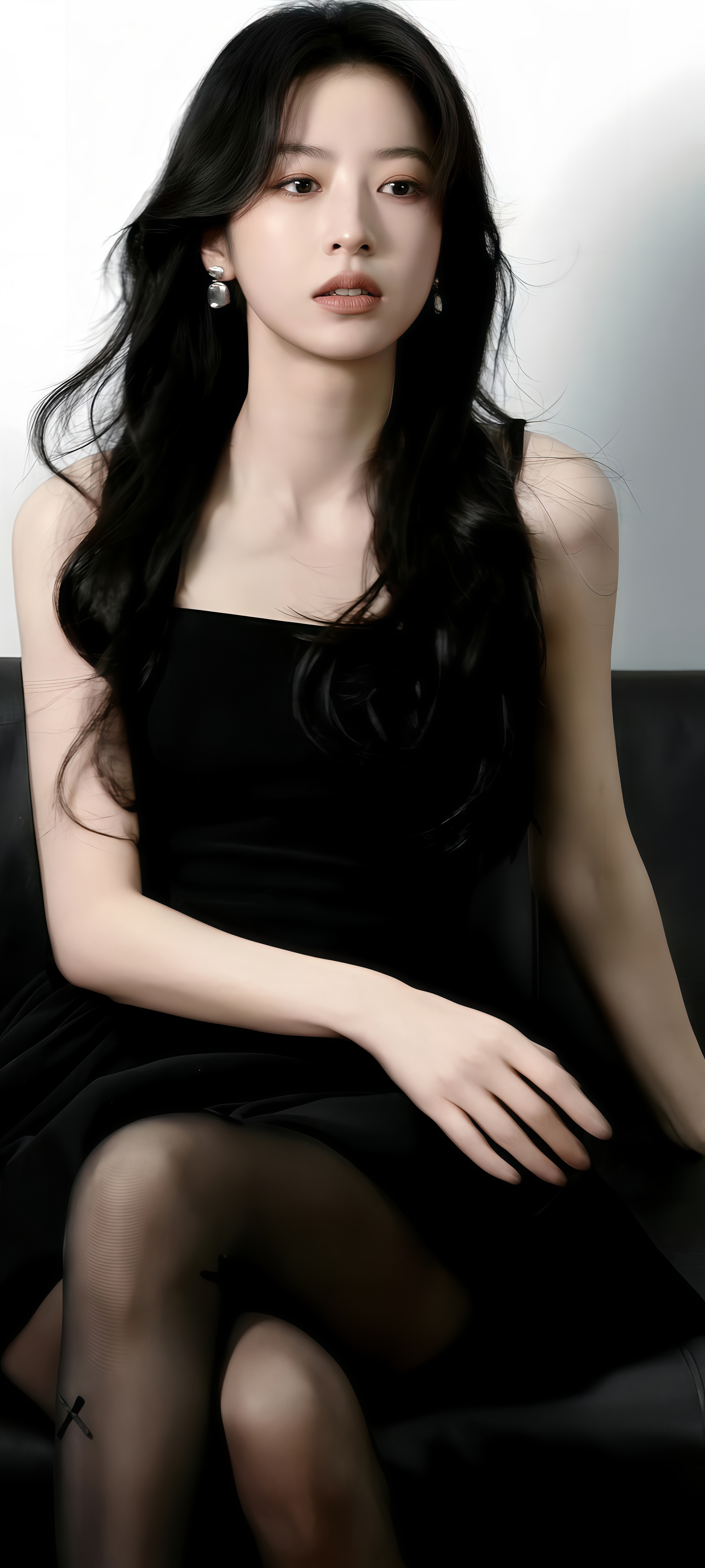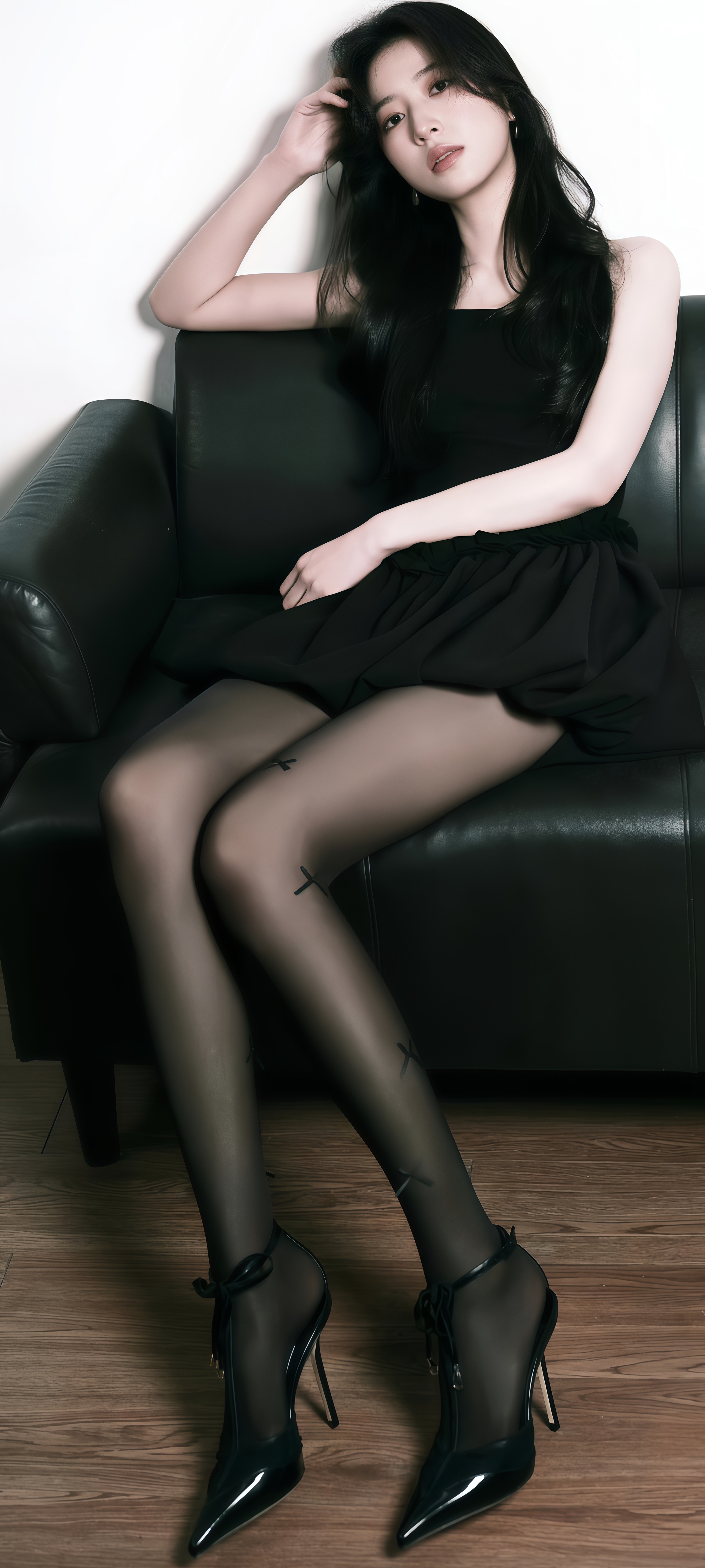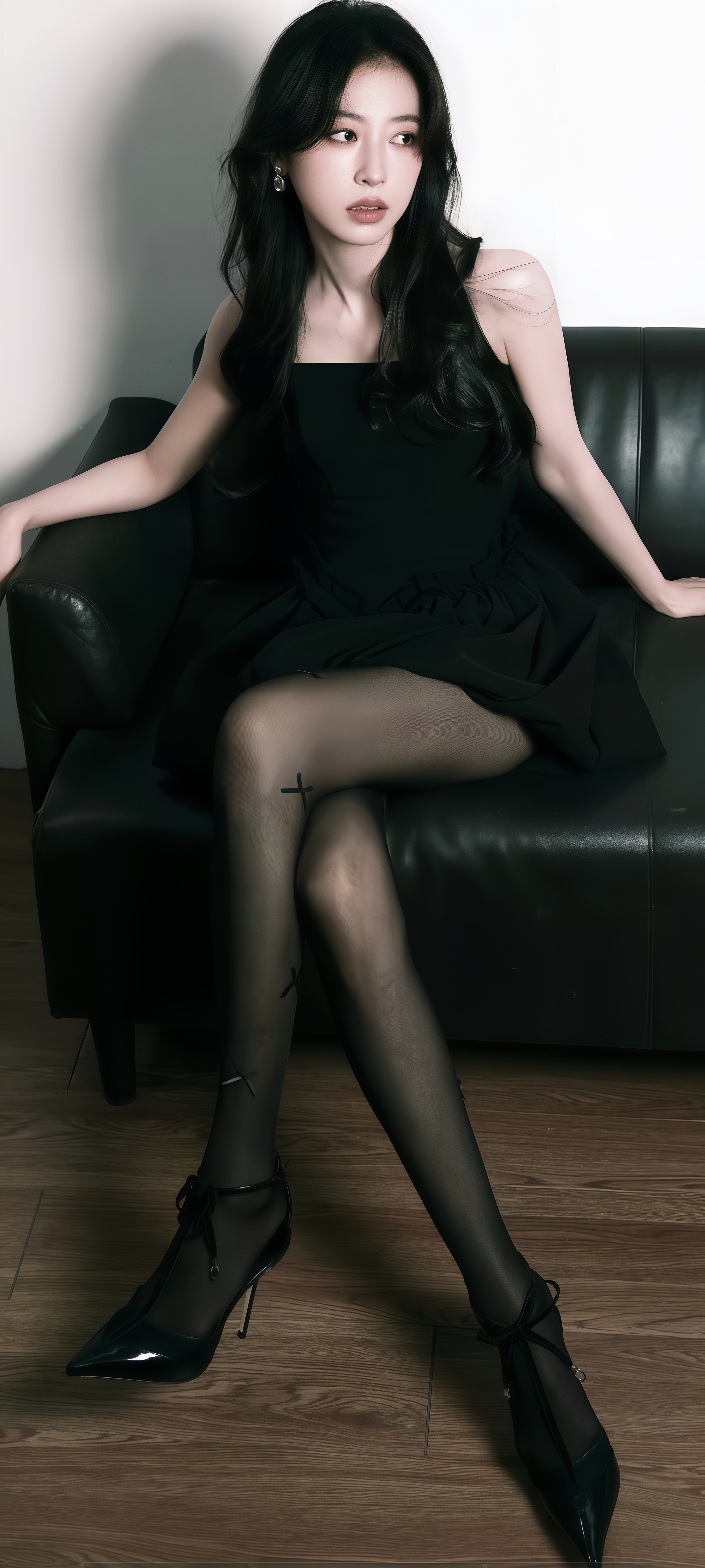 她懒靠在沙发上,发丝随意垂在肩颈,眼神漫不经心却自带勾人张力。露肩设计衬出流畅肩线,黑丝若隐若现的纹理,把“清冷”和“性感”揉得恰到好处,连指尖搭在腿上的弧度都透着漫不经心的贵气。