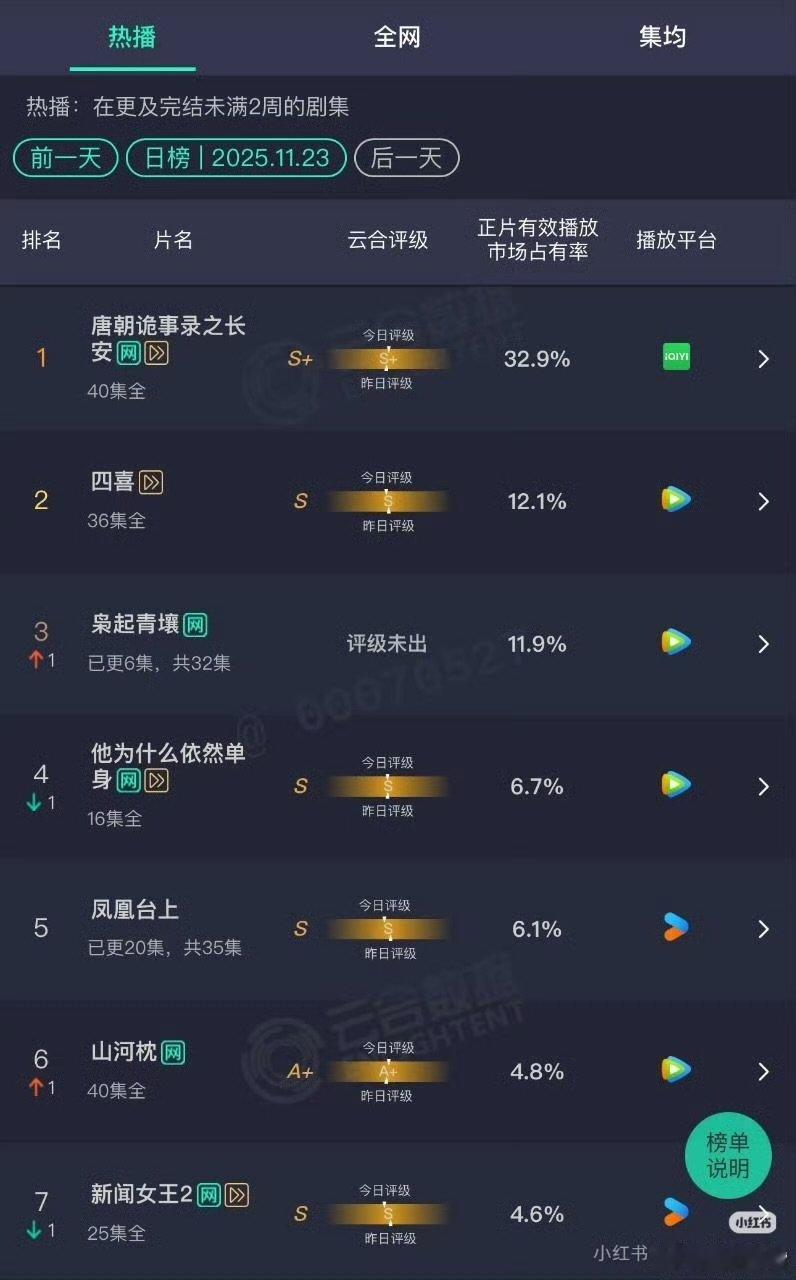 流行畅销没登顶,经典畅销没进榜,热度排名没登顶,周末单日播放量才两千万,热度连2