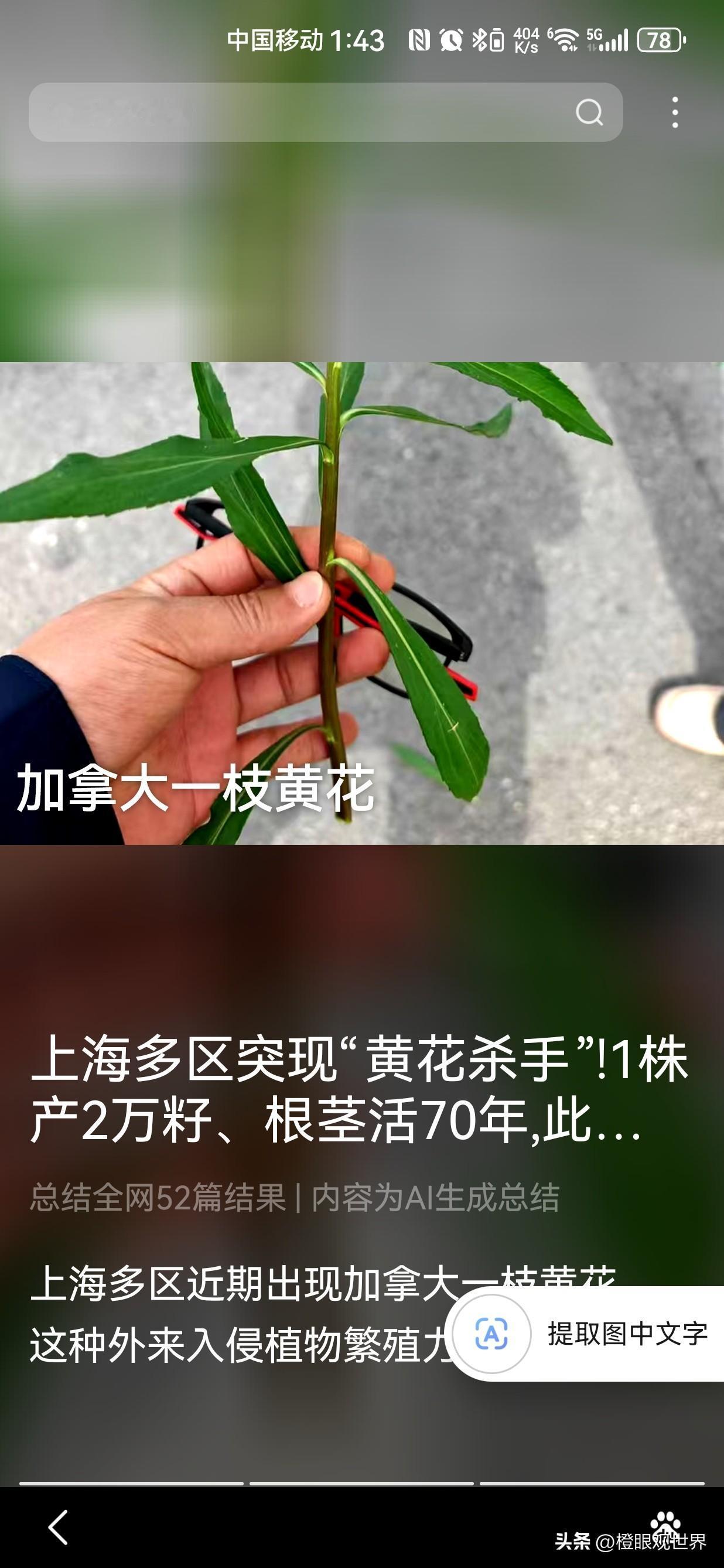 上海多区突现“黄花杀手”!1株产2万籽、根茎活70年,此花开处寸草不生,发现必须这么做! 最近上海人的朋友圈里,不少人晒出了路边金灿灿的黄花——株高近3米,花穗耀眼,看似是秋日美景,实则藏着“生态炸弹”。它就是被列入《中国外来入侵物种名单》的加拿大一枝黄花,眼下正进入盛花期,浦东、杨浦、闵行等区域已密集出现,农业部门紧急呼吁:看到千万别手软,立即上报! 很多人疑惑,不过是一簇小黄花,为何被称作“生态杀手”?翻开它的“破坏力档案”,每一条都触目惊心: - 繁殖力碾压本土植物:1株加拿大一枝黄花能结出2万多粒种子,随风飘散可扩散至数公里外,落地就能生根;更可怕的是它的地下根茎,能横向蔓延数米,存活时间长达70年,哪怕地面植株被割除,根茎也能重新冒出新芽,堪称“打不死的小强”。 - 自带“化学武器”:根系会释放有毒物质,抑制周围植物生长,哪怕是农作物、树木也难逃其害,最终形成“单一群落”——一片土地上只要它出现,用不了多久就只剩这一种黄花,本土植物要么枯萎,要么灭绝,因此才有“此花开处百花杀”的说法。 - 适应力无孔不入:耐旱、耐寒、耐贫瘠,田埂、荒地、绿化带、甚至农田里都能“安家”,上海近十年的监测数据显示,它已从郊区向市区蔓延,去年仅某区就清理了超1600亩,今年仍有新增扩散点。 更要注意的是,别把它和我国本土的“一枝黄花”搞混!本土的一枝黄花植株低矮(通常不足1米),花序分散,不仅对生态无害,还能入药——中医里它是清热解毒的良药,可治咽喉肿痛、风热感冒(首都医科大学附属北京中医医院专家证实)。而加拿大一枝黄花茎秆木质化、硬挺,花穗呈蝎尾状密集排列,身高能达1.5-3米,一眼就能看出“霸道感”,再加上花粉可能引发过敏(皮肤红肿、呼吸道不适),绝不能徒手触碰。 面对这种“霸王花”,光靠部门防控不够,需要每个人当“生态守门员”。根据上海、温岭、常山等地的防控经验,不同情况要选对方法: - 若在小区、路边看到零星几株:戴手套连根拔除(务必挖干净地下根茎),晒干后焚烧,避免根茎再生或种子传播; - 发现成片生长(比如荒地、绿化带里大片黄花):别自行处理,立即联系社区、居委会,或拨打“12345”热线,由专业人员用机械翻耕、药剂防控(敏感区域禁用农药),后续还会种植农作物或绿化植物“抢占生态位”; - 记住关键时间点:每年2-6月(苗期)、9-11月(开花结籽前)是清理黄金期,现在正是开花期,及时清除能避免明年大规模扩散。 有人说“年年清年年有,是不是白费力?”其实不然——去年常山县通过培训260余人、化学防治1000余亩,今年扩散面积已减少30%;温岭市制定专项方案后,农田里的黄花基本被清除。外来物种防控本就是“持久战”,少一株黄花,本土的蒲公英、狗尾草,甚至农作物就能多一分生存空间。 你最近在小区绿化带、路边荒地见过这种“高大大黄花”吗?如果发现了,别犹豫,马上联系社区或打12345!也欢迎在评论区说说你的发现,让更多人学会识别、参与防控——生态安全,从来不是某个人的事,而是我们每个人的“家门口责任”!
