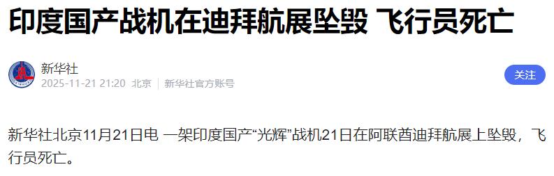 “光辉”坠机后,仅剩中俄战机完成飞行表演! 11月21日,是迪拜航展的最后一天,这本应是精彩特技表演的高潮时刻,印度空军的“光辉”MK1A轻型战斗机却突发意外。 据现场目击者描述,这架战机正在进行低空负G机动滚转时突然失控,机头急剧下俯冲向地面,随即引发剧烈爆炸,滚滚黑烟迅速笼罩了航展现场,让在场数千观众和各国代表惊出一身冷汗。 而根据社交媒体流传的视频显示,战机坠毁前未能完成改出动作,尽管配备了号称“地面高度也能安全弹射”的马丁-贝克零零弹射座椅,但并未出现弹射迹象。 迪拜官方随后证实,消防和救援人员在几分钟内抵达现场封锁区域,所幸事故未造成地面人员伤亡,但37岁的飞行员纳曼什·西亚尔中校不幸遇难。这位拥有米格-21和苏-30MKI丰富飞行经验的空军中校,最终没能平安返航。 印度国防部长拉杰纳特·辛格对失去“勇敢无畏的飞行员”表达深切悲痛,巴基斯坦国防部长阿西夫也在社交平台发文哀悼。目前印度空军已启动调查,将重点审查飞行控制律、软件故障、发动机性能等多个方向,甚至考虑动用人工智能工具加快调查进程。 值得注意的是,这并非“光辉”首次出事,2024年3月的一次训练飞行中就曾因发动机故障坠毁,当时飞行员成功弹射逃生。 坠机事故带来的冲击迅速蔓延,原计划剩余的12场飞行表演中,有10场被紧急取消。 在这样的紧张氛围下,俄罗斯“勇士”飞行表演队和阿联酋“骑士”飞行表演队成为仅有的坚守者,按原计划完成了全部表演科目。 巧合的是,“勇士”队驾驶的是俄制先进战机,而“骑士”队则刚刚完成全面换装中国L-15“猎鹰”高级教练机,此次亮相正是其换装后的全球首秀。虽然“光辉”战机以这样的方式抢占了航展头条,但中俄战机的稳定表现却在无形中证明了自身的可靠性。 中国L-15“猎鹰”作为中航工业洪都自主研制的双发超音速高级教练机,不仅已成功出口赞比亚、委内瑞拉等多个国家,还具备训练效费比高、机动性强、使用寿命长等显著优势。其采用的三轴四余度电传飞控系统和玻璃化座舱,能模拟三代甚至四代战机的操控特性,单机售价仅为美国T-50的60%,在国际军贸市场备受青睐。 俄罗斯此次在航展展出了包括苏-57E战机在内的850多款产品,“勇士”队的完美表演更是展现了俄制战机的成熟性能。 对中俄而言,这次意外反而成了一次“实战广告”,用实际表现向国际市场证明了产品的稳定性。但更让人揪心的还是那位遇难的印度飞行员,希望印方能尽快查明事故真相,尤其是弹射系统未能启动的原因,给逝者家属一个负责任的交代。 航空表演本是展示实力的舞台,而安全永远则是不可逾越的底线。