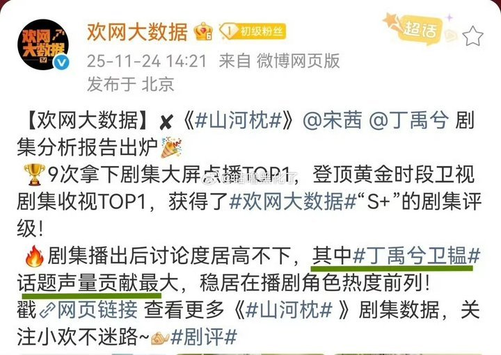 11月24日欢网大数据在播剧舆情热度榜和大屏点播榜第二和第三!稳定在S+,虽然