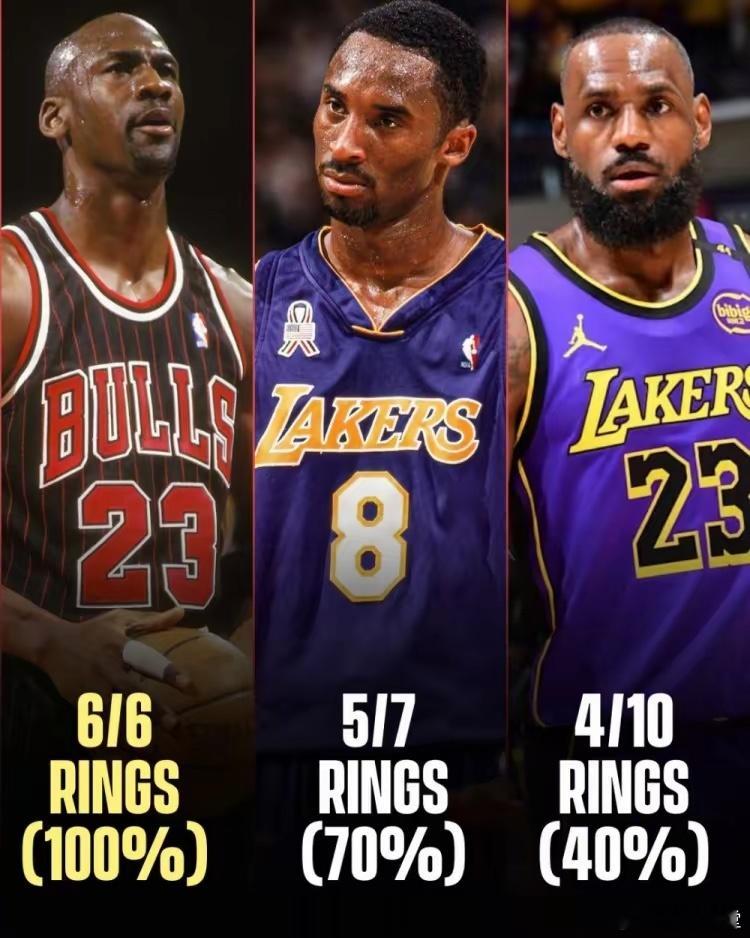 乔詹科进总决赛夺冠次数:乔丹6冠胜率100% 科比5冠70% 詹姆斯40%