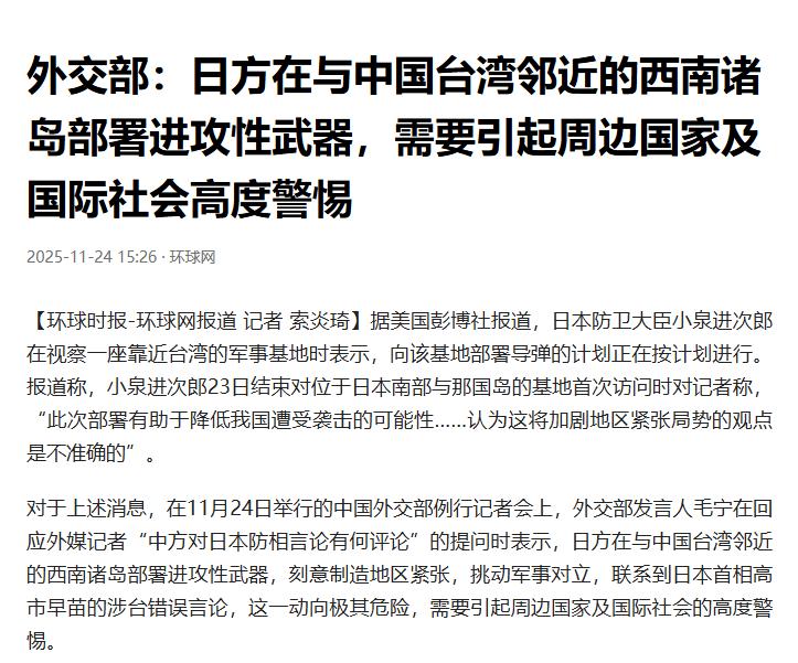 日本再次作出前所未有挑衅举动。日本防卫大臣表示将在台湾附近岛屿军事基地部署导弹。 不久前,日本首相高市早苗抛出了所谓的“台湾有事即日本有事”的说法,这番话可不是简单的政治口号,它为日本后续一系列军事冒险行动打开了方便之门,也让外界看清了日本想要挣脱战后秩序束缚的真实意图。 有了高层的定调,具体执行者很快就登场了,11月22日,日本防卫大臣小泉进次郎马不停蹄地赶往冲绳县,开启了一场目的性极强的视察。 根据日本媒体的报道,他的行程直奔主题,先是访问了宫古岛和石垣岛,和当地官员商讨如何强化军事防御,紧接着,他踏上了一个地理位置极其敏感的岛屿——与那国岛,这个地方距离咱们中国的台湾省只有大概110公里。 在与那国岛上,小泉进次郎与当地町长上地常夫会面,直接摊牌,明确告知日本防卫省要在这里部署导弹部队和电子战部队,他嘴上说着这是为了“守护岛屿安全”,能“降低遭受攻击的可能性”,甚至辩称此举不会加剧地区紧张。 但谁都明白,在距离台湾如此之近的地方部署攻击性武器,这根本不是防御,而是赤裸裸的威慑与挑衅,是把枪口直接顶到了家门口,这番操作,就是要把高市早苗的口头威胁,变成实实在在的军事压力。 面对日本这种在家门口舞刀弄枪的危险行径,我国外交部发言人毛宁在记者会上给出了明确而坚决的回应。 她一针见血地指出,日本在其邻近台湾的西南诸岛部署进攻性武器,就是在故意制造地区紧张,挑动军事对抗。 毛宁特别强调,把这个行动和高市早苗的错误言论联系起来看,其动向极其危险,整个国际社会都必须对此高度警惕。我方的态度很明确:这种危险的游戏,我们看在眼里,绝不会坐视不管。 深挖下去就会发现,日本这一连串的动作,其实是其国家战略长期谋划的结果,他们根本目的就是想彻底推翻“专守防卫”的原则。 这些年,日本通过修改安保法、深化日美同盟,一直在小动作不断地试探底线,企图挣脱和平宪法的束缚,所谓的“台湾有事即日本有事”,不过是他们妄图插手台海问题,借着大国博弈的浑水,实现自身军事松绑,彻底改变二战后东亚安全格局的借口。 这种玩火行为的危害是显而易见的,对日本国内,这是在绑架民意,违背了多数民众向往和平的愿望;对外,则严重损害了中日关系,更是给和平稳定的台海局势投下了一颗重磅炸弹。 作为二战的战败国,日本本应牢记历史教训,恪守和平承诺,尊重邻国的核心利益,然而,它现在却一意孤行地在军事扩张的道路上越走越远,已经成了整个东亚地区一个极不稳定的因素。 对于这种开历史倒车的行径,所有爱好和平的国家都必须保持警惕,并做好坚决反制的准备。