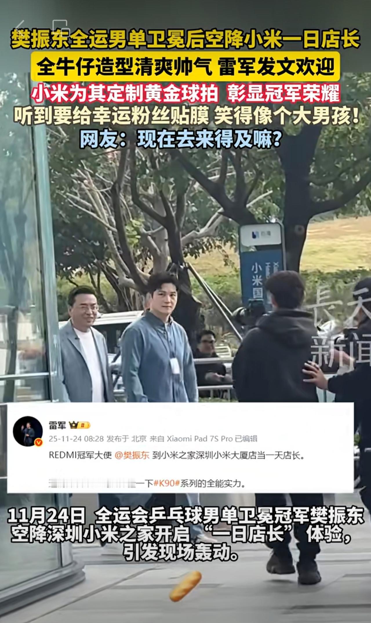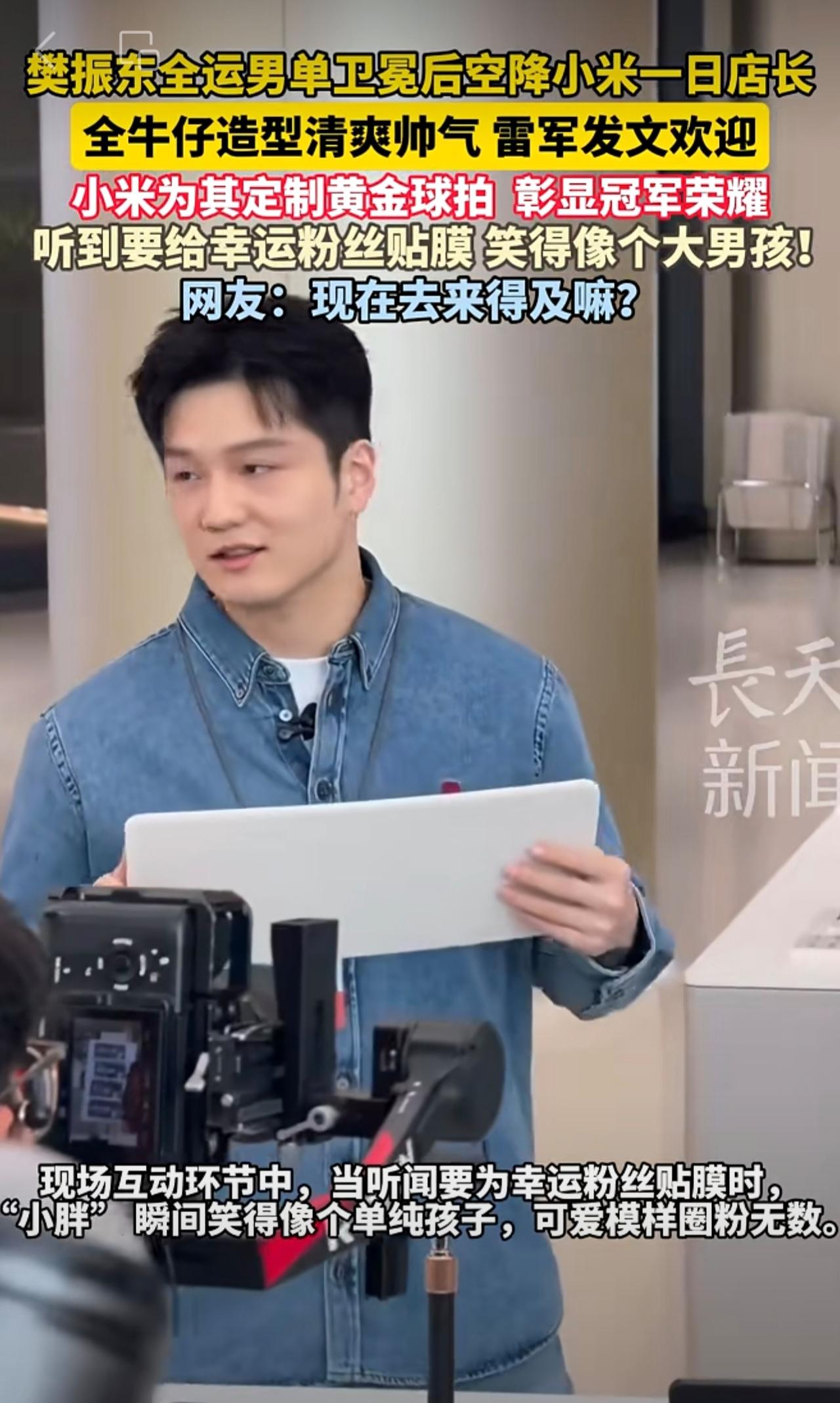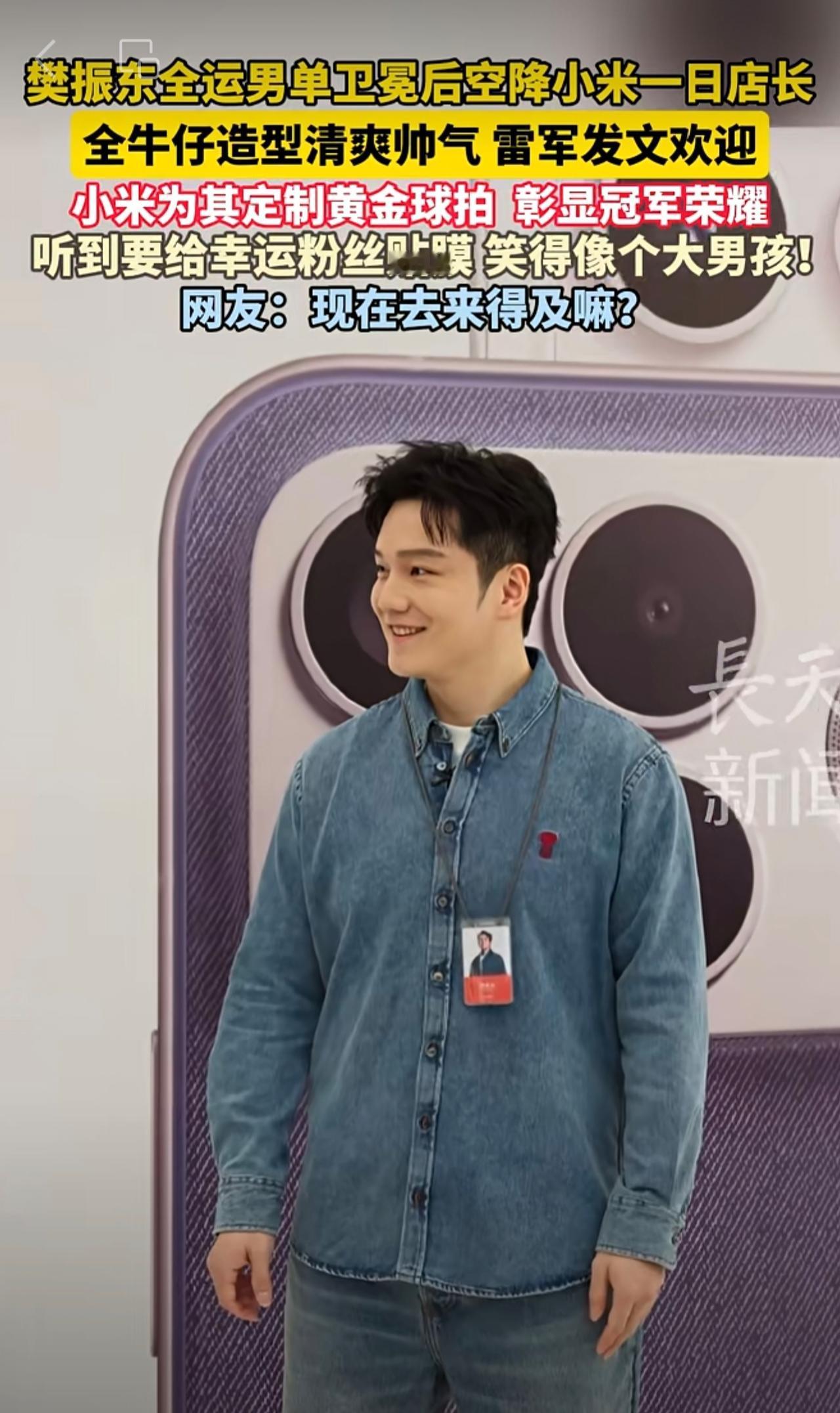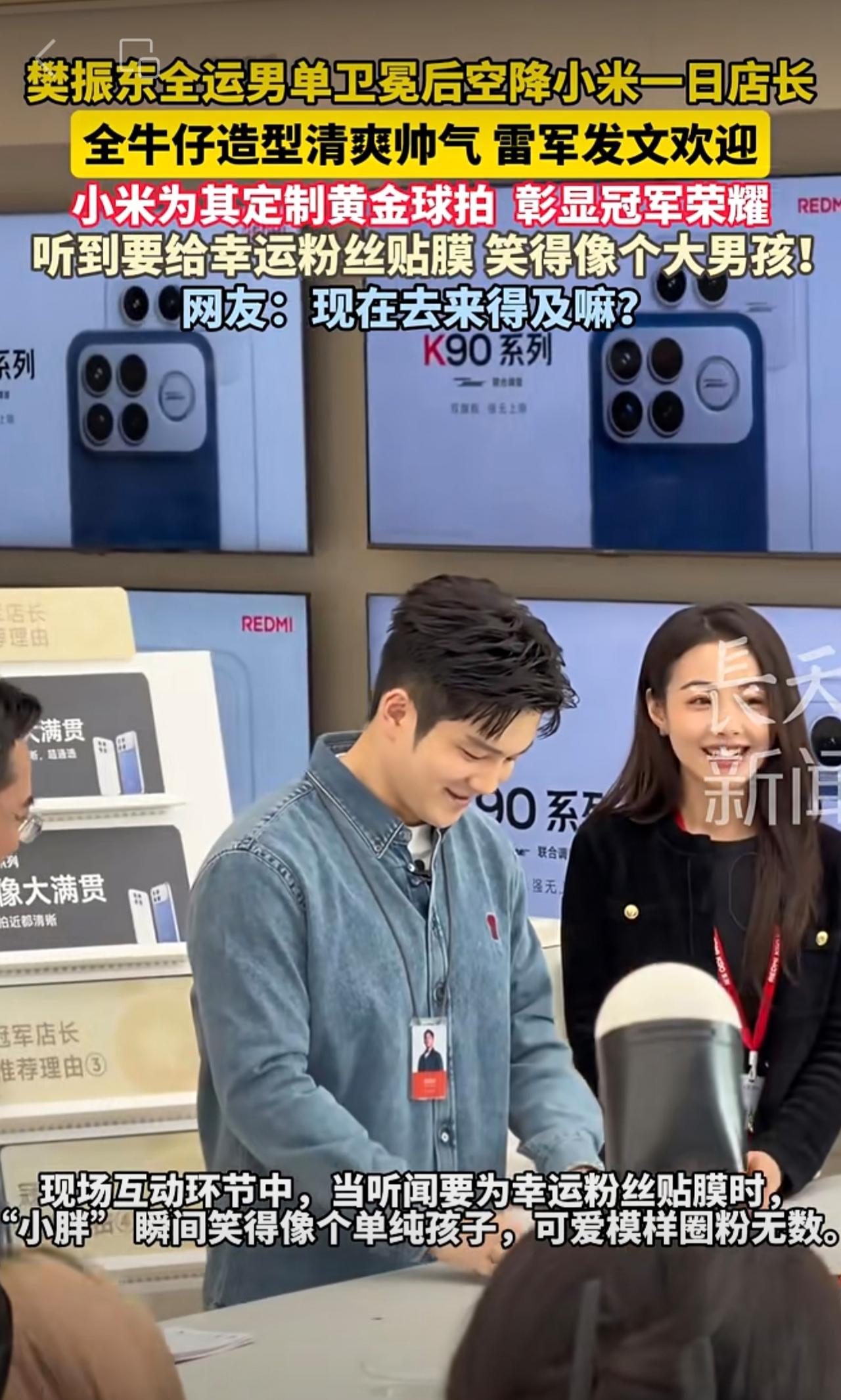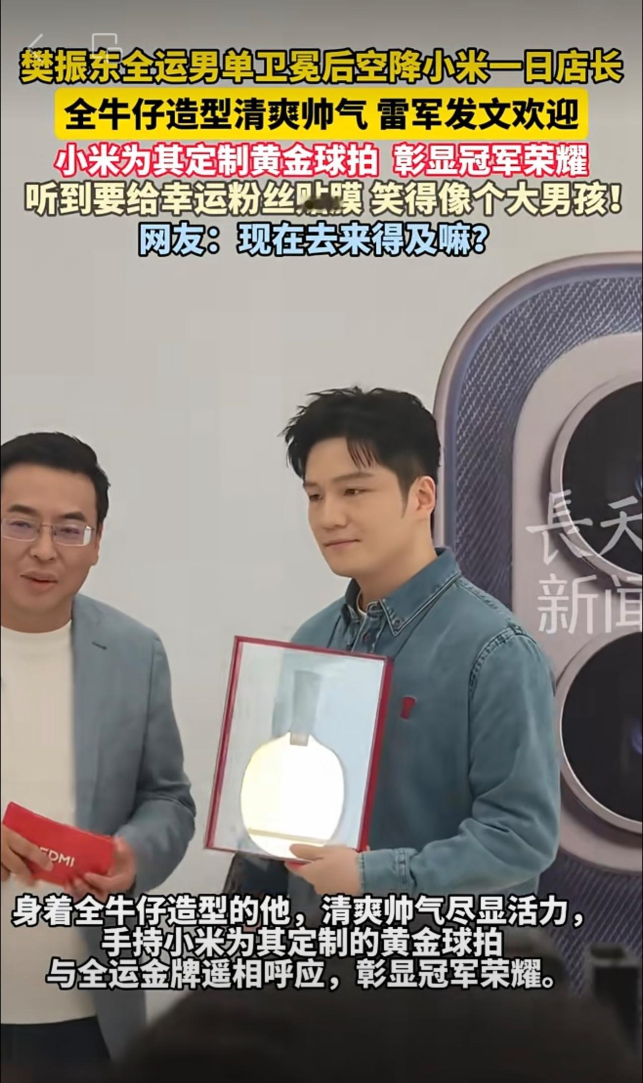单卫冕后空降小米一日店长,全牛仔造型清爽帅气, 雷军 发文欢迎,小米为其定制黄金球拍 彰显冠军荣耀,听到要给幸运粉丝贴膜, 笑得像个大男孩!网友:现在去来得及嘛?