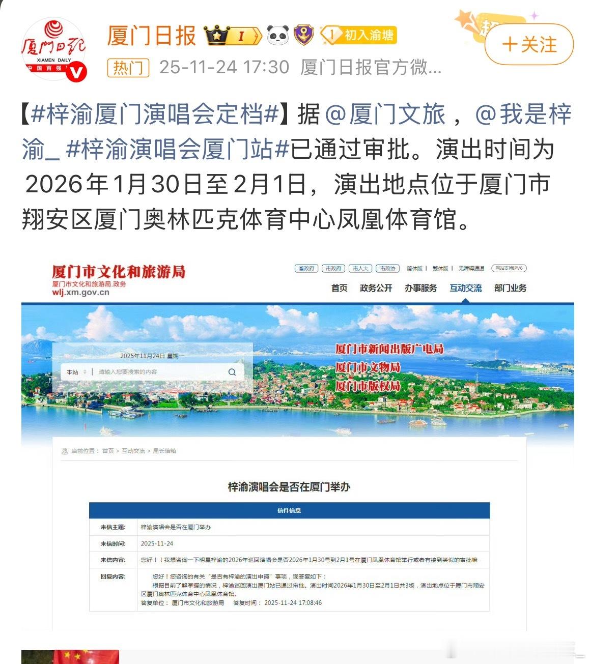 梓渝厦门演唱会过审了,期待演唱会了,厦门媒体特意发文祝福,花路已来