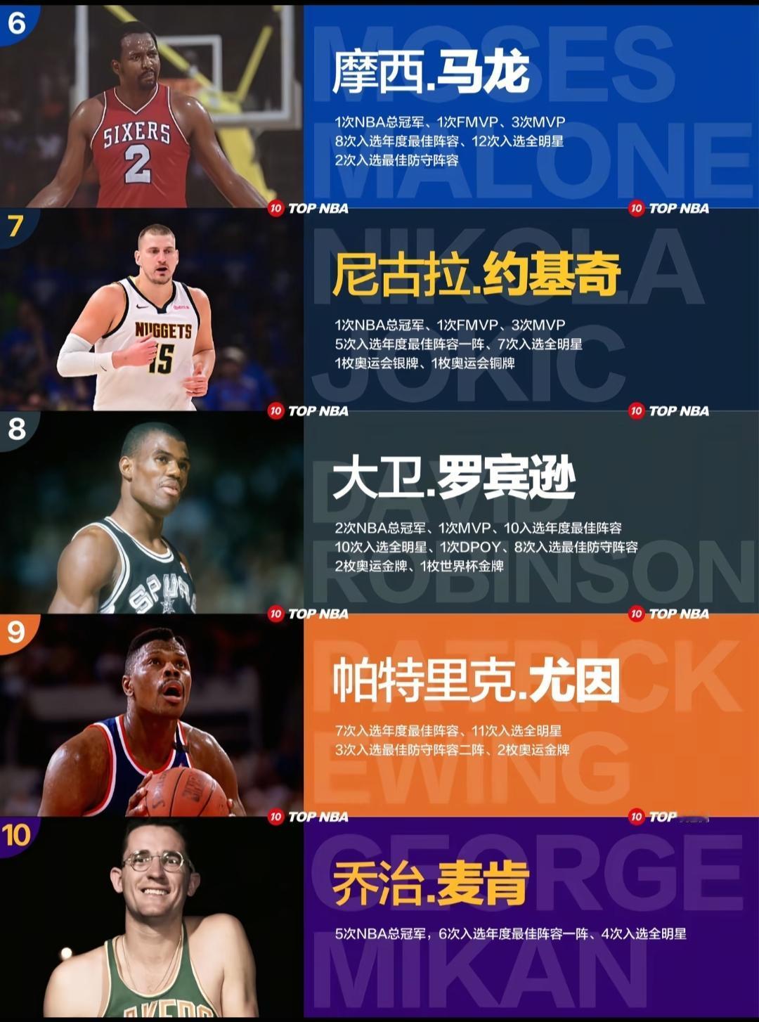 美媒评选历史十大中锋,约基奇已经进去了! 第一肯定是贾巴尔,和拉塞尔争夺。 张伯伦100分很牛,其他差他们二人很多。 奥尼尔历史第四,又是多少人心中的第一? 奥拉朱旺能第五名不错了。 摩西马龙第六名。 约基奇目前第七,数据非常牛逼,还得拿冠军证明自己呀!![得意]