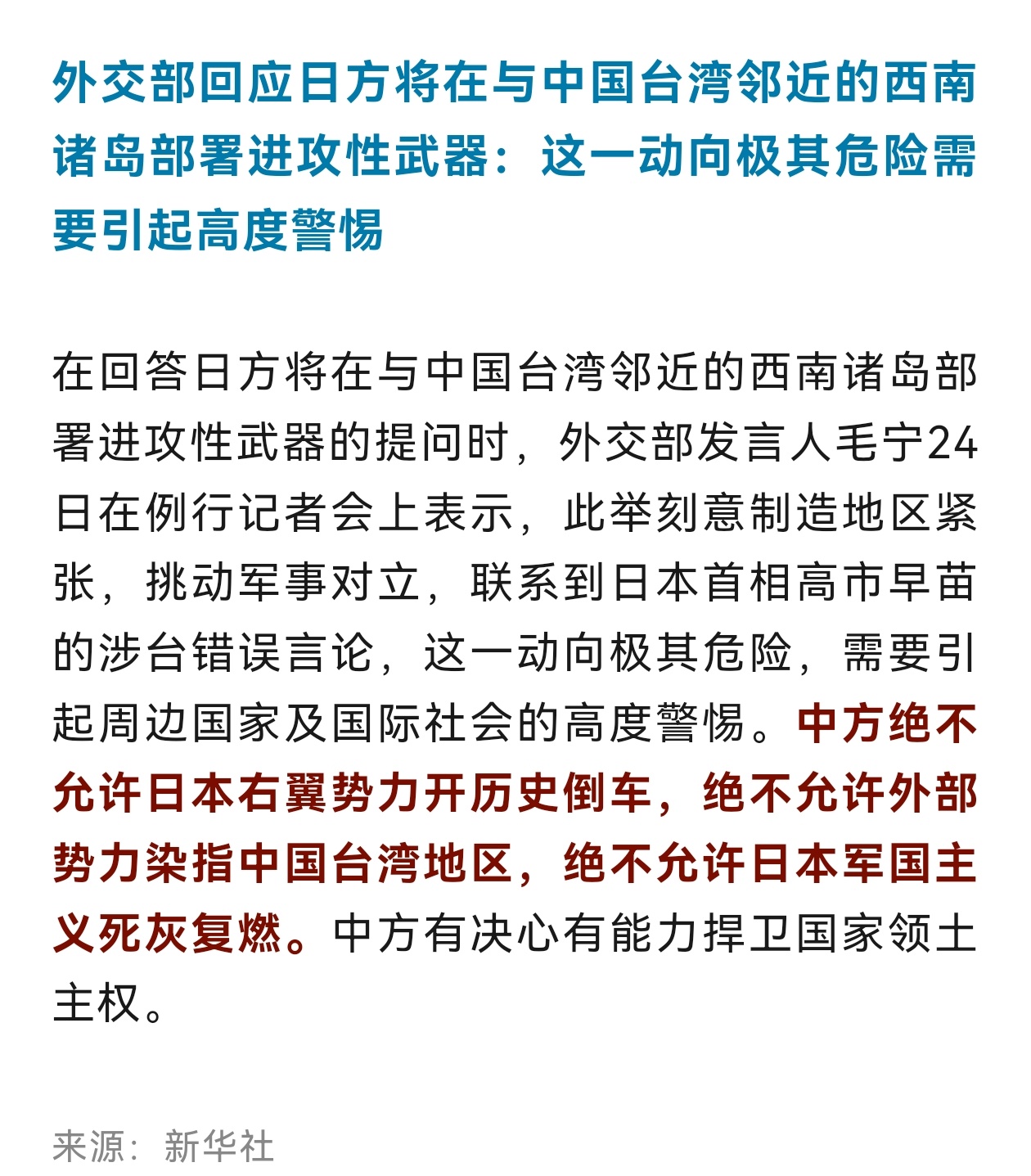 就日方将在与中国台湾邻近的西南诸岛部署进攻性武器,中方回应三个“绝不允许”!