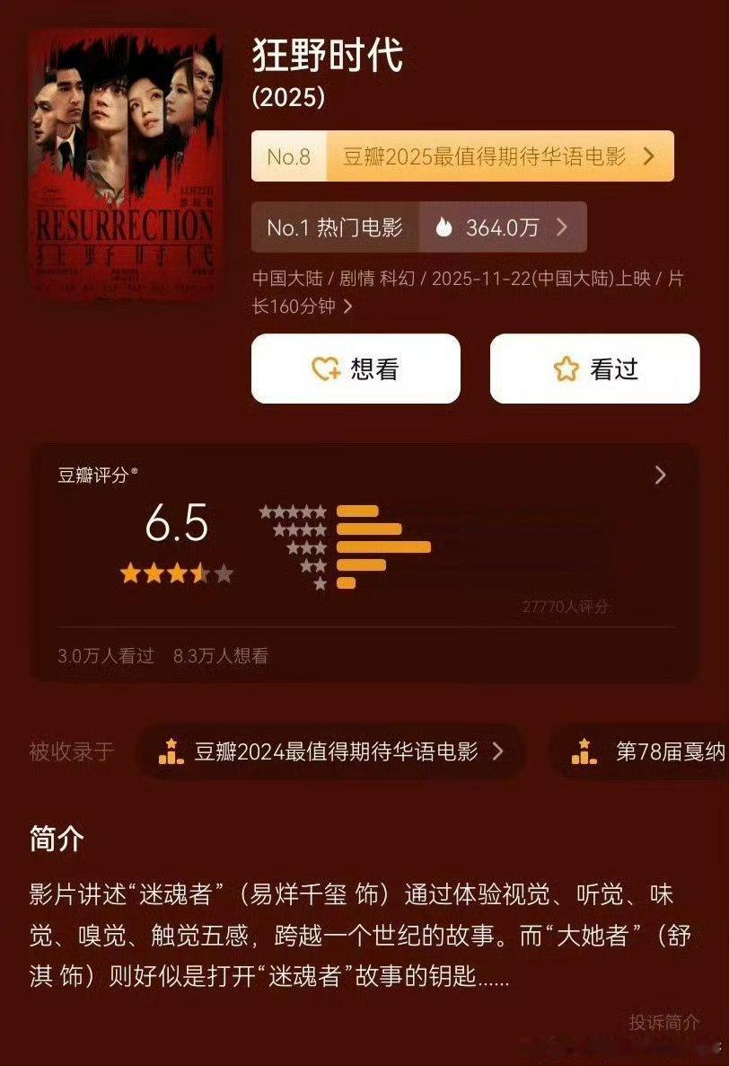 易烊千玺、舒淇《狂野时代》豆瓣开分6.5 ,大家都看了吗
