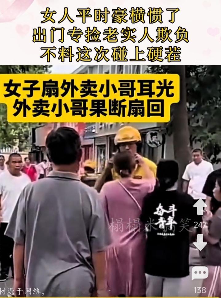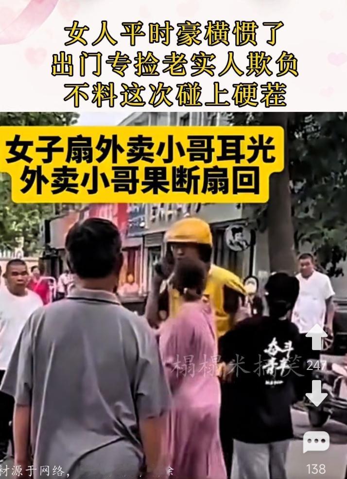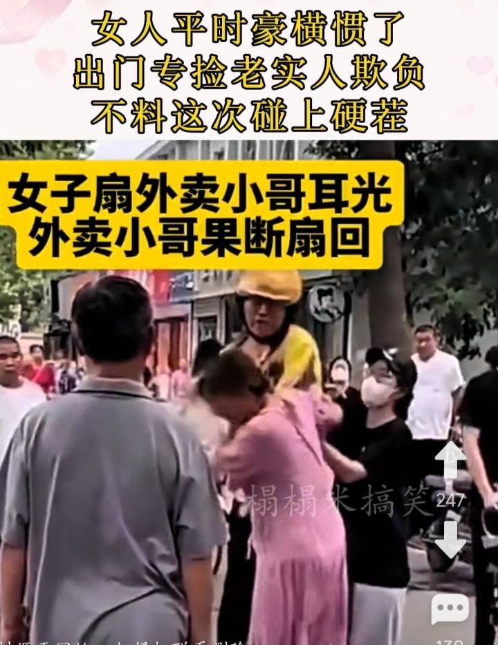 有些女子有时真的不可思议,在家豪横惯了也就算了,出门在外也一样的豪横。 这不,这女子在街上与一小卖哥发生小小摩擦。她不由分说上前就煽人家一个耳光。 小卖哥也不客气,当即回了她一个更大的耳光。 这女子傻眼了,她没有想到他会还手。当然,她也不敢再动手。因为小卖哥喝道,你再动手试试! 街上经常遇到火气比男人更大的女子,她们就不懂得祸从口出?不知道一动手自己就先吃亏? 真不知道她们哪里来的胆量。