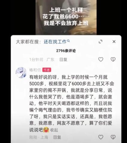 良心不会痛吗?上海一女生上班1周就辞职,工资还没拿到,却先花了爸爸6600元,爸爸捂脸崩溃哭泣,他工作时出意外,10个手指头3个都断了,不料,女儿不仅不心疼,还在一旁笑嘻嘻的称:“我不会放弃上班的,1000哪够花!你再给我点吧。”网友:看父亲的双手,她是怎么忍心花下去这个钱? 女生好不容易找了份4000工资的工作,刚上一周班,就跟家里要了6600块。爸爸每次都没犹豫,认为女儿是去打点人际关系。结果,都被女儿拿去买自己的东西挥霍一空,爸爸感到很崩溃,女儿还嬉皮笑脸地说:“爸,你咋了?上班花销本来就大,一千块哪够花啊!” 没等爸爸开口,她又晃着手机说:“对了爸,我辞职了,跟领导说爷爷脑梗加重,得带他去外地治病。”爸爸瞬间明白——这就是女儿不想上班的幌子! 看到爸爸哭泣,女儿还笑着说:“爸,我回来陪你,开心不?” 视频发到网上,女孩被网友批判,可她却怒怼网友:“我花我爸钱,他天天喝酒,那天是喝多了激动,不是哭我花钱!我爸乐意给我花,关你们啥事?” 看得出,这女孩是被惯坏了。 最让人寒心的,不是花了6600块,是她压根没把父亲的付出当回事。她知道父亲的手指是为了挣钱才断的,却拿爷爷的病当辞职的幌子——连最基本的人伦和感恩都没有。 她已经成年了,早该明白“挣钱不易”,就算没挣过钱,也该知道父亲的手不是天生残缺。网友骂她,不是多管闲事,是看不惯有人拿着父母的血汗钱挥霍,还理直气壮——这戳中了所有人的底线:再疼孩子,也不能丢了“感恩”的根。 她后面还评论说:我乐意,我爸乐意,还会继续花她爸的钱的,这什么人! 她甚至还说:我上学时一个月就5000多,视频里花了6000多去上班,又不会家里穷的揭不开锅,我爸愿意,我愿意,网友不愿意了,算了你们爱说说吧! 其实,这就是长期溺爱换来的结果:她习惯了父亲的付出,却忘了该怎么回报。 “羊有跪乳之恩,鸦有反哺之义”,女生要是一直这样下去,迟早会栽跟头——等父母老了,没人再给她钱,她才会明白,那些被她挥霍的不只是钱,还有父亲用血汗攒下的爱,和本该属于她的“感恩之心”。 爱孩子不是“无底线满足”,疼孩子不是“替他扛下所有”。真正的爱,是让他看见你的辛苦,教他学会体谅;真正的疼,是让他自己摔跟头,明白“一分耕耘一分收获”。毕竟,父母能护孩子一时,护不了一世,教会他“感恩”和“独立”,才是能陪他一辈子的底气。 你们对此事怎么看?
