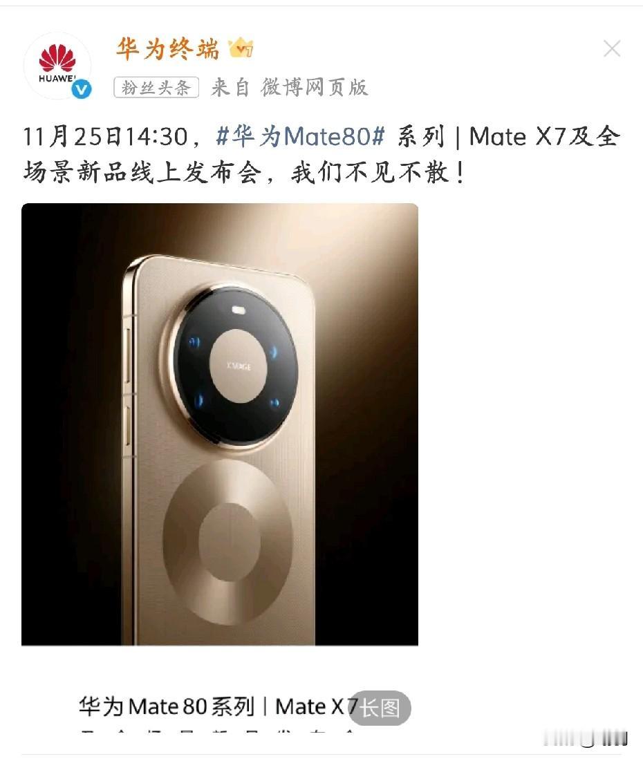 华为mate80发布会 主要社交平台将全程直播 观看人次有望超亿。 华为今日官宣 10月25日下午14:30 举行线上发布会。 此次线上发布会 除华为官网外 主要社交平台微博,微信,抖音,快手都将全程直播 观看人次或超以往 极有可能达上亿人次。 人次方面甚至可能超春晚。 mate80