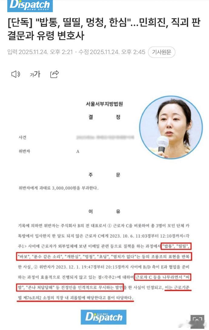 Dispatch曝光闵熙珍职场霸凌的判决书。判决书中写到闵熙珍在群聊中反复使用嘲讽性语言,闵熙珍则辩解称这是为了指导员工的工作态度。