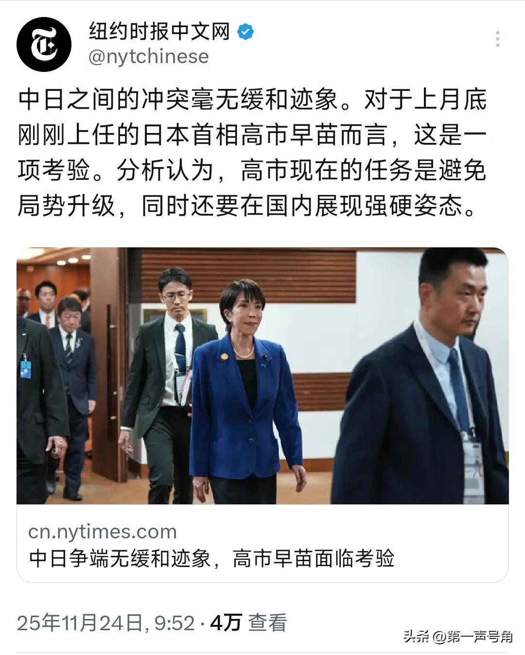 纽约时报中文网今天(11月24日)写道:“中日之间的冲突毫无缓和迹象。对于上月底刚刚上任的日本首相高市早苗而言,这是一项考验。分析认为,高市现在的任务是避免局势升级,同时还要在国内展现强硬姿态。” 评几句 高市早苗在台上摆出的“强硬”不过是一张纸糊的面具,背后是对中国反制力度心里没底的忐忑。她越想在国内表演“我不怕”,越暴露骨子里的战略空虚:既不敢真踩红线,又舍不得右翼那点选票。所谓“避免升级却要嘴硬”的平衡术,说穿了就是走一步看一步的赌命游戏——赌中国不会被彻底激怒,赌美国会随时兜底。可惜,历史留给赌鬼的筹码从来不多,日本若真被拖下水,第一个淹死的就是拿民族命运当筹码的政客。