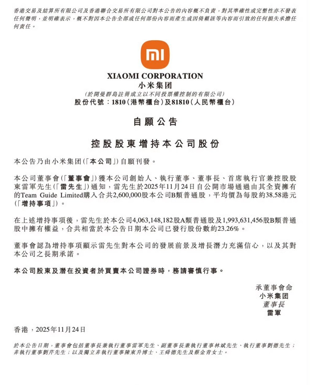 小米最近动作挺大11月20号,小米公司5.07亿港币回购;11月21日,又再回购了3亿港币今天24号,雷军个人又增持了1亿咳咳,雷子是真心想拉股价啊