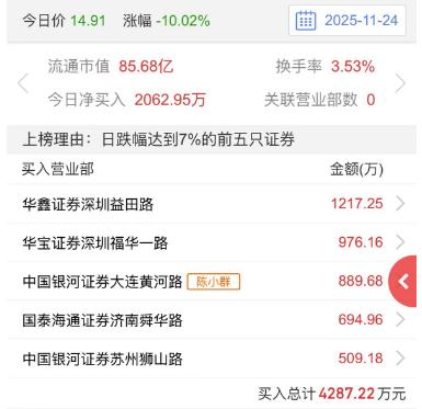 陈小群航天加仓1.0462亿,做T1亿三千万,早上看到航天动力上板,猜测航天发展可能会反包,毕竟陈小强在里面,果不其然他加仓做T。记得上周陈小群还晒了持仓图,除了航天,平潭和九牧都是赚的,今天航天反包,但九牧却二连跌停了,陈小群还买了900万,很多人也都跑出去了,明天不会也来个反包吧!高位股虽然赚钱,但亏钱也是相当厉害,尤其是三木,又跌停了。 航天之所以能反包,除了陈小群,还要源于军工爆发,靠他一个人的力量是不够的