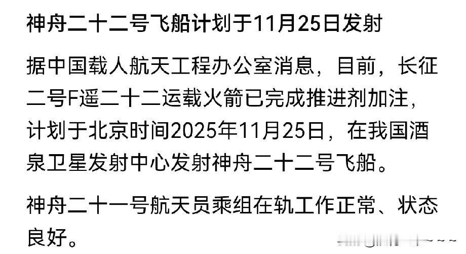 天呐!美西方眼珠子都瞪出来了吧? 不是真牛逼,确实牛逼!这次几天时间,神舟二十二号飞船又要于11月25日发射了!这神舟20号航天员刚顺利回来没几天,神舟21号刚飞上天没几天烧烤还没吃过瘾,咱这地面的人激动的心情还没消下去呢,神舟22号又要带着更重要的任务出发了。 就这发射速度和发射节奏,以及不断完成的航天任务,你们说美西方看了能不羡慕,能不眼珠子瞪大吗?那些西方宇航员还不天天抱着个录像去研究,派些情报员来打探,咱们怎么在航天领域怎么那么多任务啊? 要知道咱们的航天领域已经进入了商用时代,要开始利用航天成果在各领域赚钱喽!