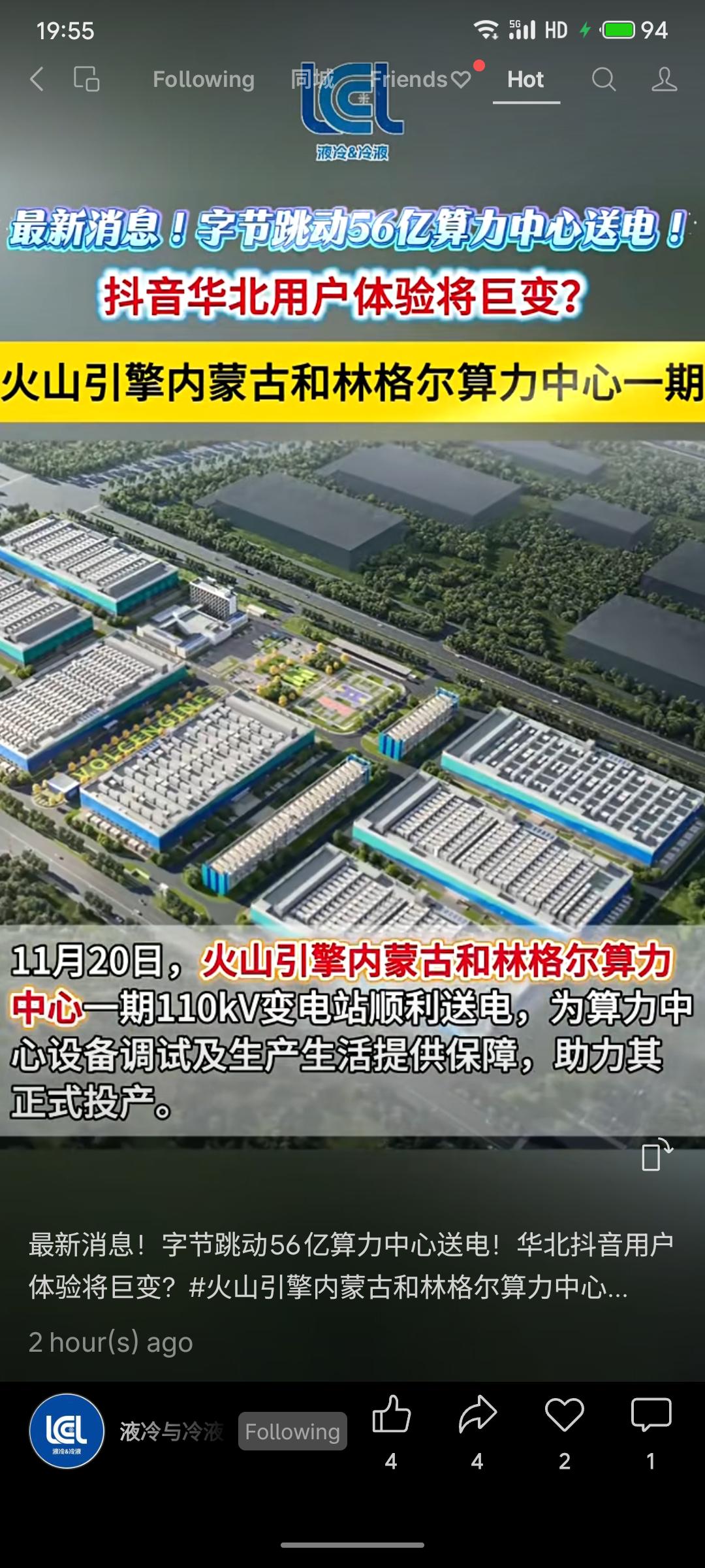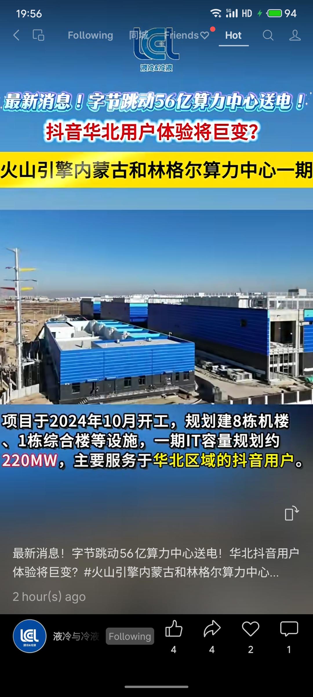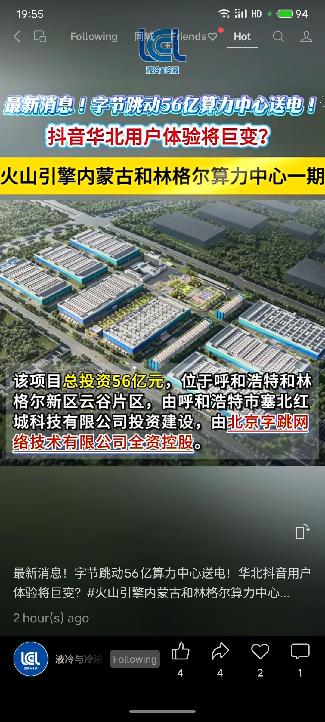 字节跳动投资56亿元的内蒙古和林格尔算力中心一期已成功送电。该项目IT容量达220MW,将显著提升华北地区抖音用户的视频加载速度与内容推荐精准度,标志着字节跳动基础设施布局取得关键进展。