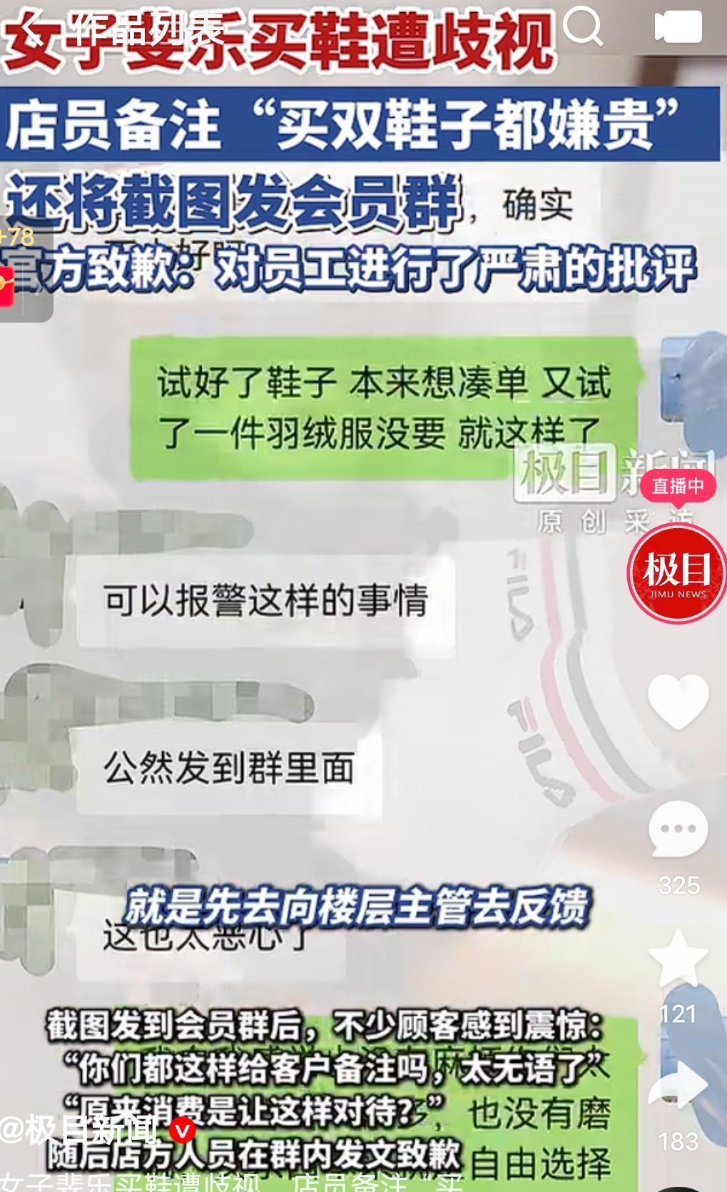 太令人无语了!河南郑州,一女士带孩子去“斐乐儿童店”购物,不料,交易完成后,店员竟然把这次购物截图发到会员群里,并且标注为,“买双鞋子还嫌贵!”网友:那啥看人低。 11月23日这天,家住郑州的一位女士,她没想到,只是普通的一次购物,事后却令她气愤不已。 原来,当天她带着孩子到“斐乐儿童”店里买鞋子,就因为期间抱怨了几句东西太贵,由此服务员便牢牢记住了,交易完成后,服务员便把截图发到群里,并注明此客户买双鞋子还嫌贵。 这位女士发现后,不由火往上撞,她问服务员,“你们都这样给客人备注吗?” 服务员解释,“不好意思,发错了。” 可这么明显带有歧视的字眼,哪是一句“发错了”就能糊弄过去的呢? 于是,这位女士打电话给商场客服,说了此事情的经过。 现在,商场管理员已经介入此事。 有的网友评论,一个服务员,你还看不起卖鞋的,一个月挣多少钱?你能买得起么? 有的网友评论,很多店员干的时间长了,就会有一种莫名的优越感,感觉品牌是她自己的了,我有次挤公交,亲耳听见两个奔驰的导购在那蛐蛐看车的,那鄙夷和高傲就差写脸上了,我还以为店是她俩的。 商店本就是买卖双方谈论价钱的地方,顾客说一下价钱贵有啥不妥?就这,也被标注买不起鞋!我看,分明就是戴上有色眼镜看人而已。 这种人,如果真的富可敌国也可以,偏偏还和大家一样,殊不知当他瞧不起别人时,而恰恰他们自己,也在此之列! 真是讽刺。 最后,我提议大家,看看自己购物群里,有没有被人贴上标签哦,别被划入另册了,还不知道呢。