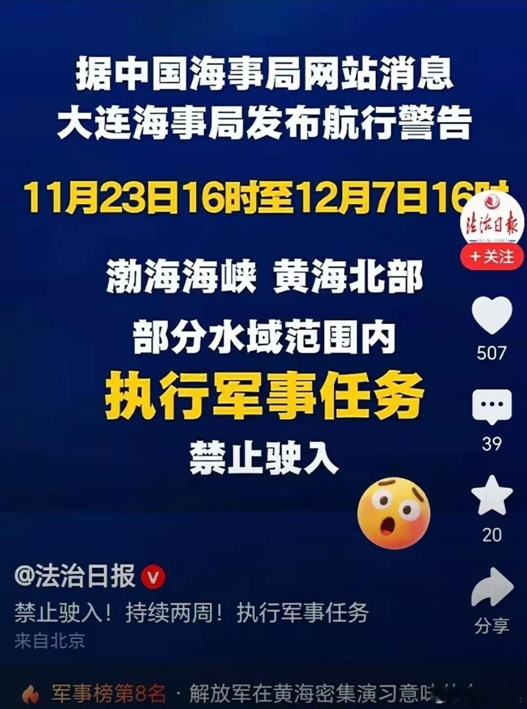 惊呆了!这是要准备开战了吗?刚刚刷到《法制日报》的视频,看到大连海事局发布的最新通知,从今天下午4点开始到12月7日16时,整整两周时间,在渤海、黄海执行军事任务。值得注意的是,这次不是军事演习而是军事任务,这意味着什么?但是我觉得可能只是军事调动,起到震慑的作用,打可能是打不起来,目前来看,世界上还没有那个国家敢对中国仓促开第一枪。但是我们作为老百姓,关心国家大事没有错,但不能给国家添乱,老百姓该做什么做什么,一旦国家有需要,我们全力以赴的为国家做出应有的贡献就行。