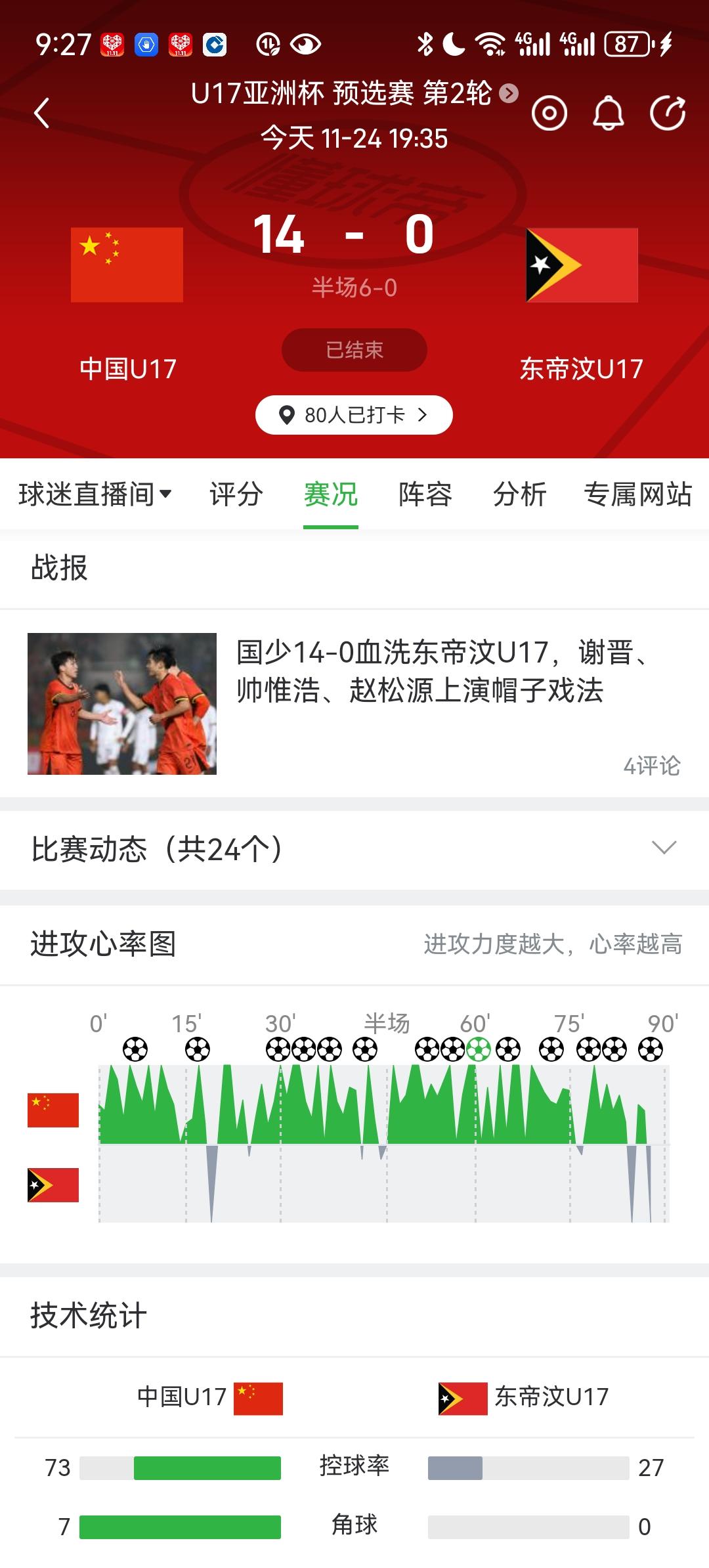 14比0!这是一场大屠杀大灭绝!国少这批孩子真的强啊,虐菜能力一流。打东南亚鱼腩还是要发挥传统高中锋优势,国足现在已经不会了,国少终于将这种传统拾起来了。张伯霖、赵松源这两个大中锋是砸到东帝汶的小孩欲哭无泪啊[捂脸]下一场对更弱的文莱会不会来个20比0,期待一下。