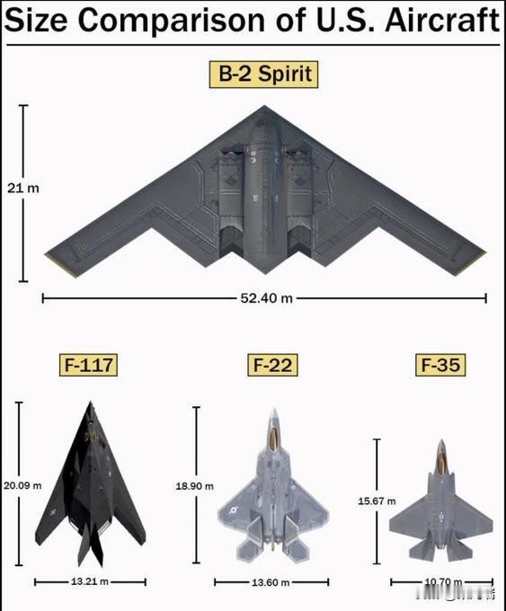 四种美国战机的尺寸比较,包括B-2Spirit、F-117、F-22和F