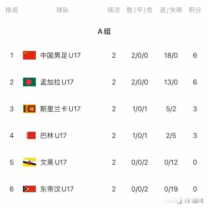 赛前都以为巴林U16男足是亚洲杯预选赛U16国足的最强对手,没想到第一轮孟加拉就抢镜了,他们以5-0战胜东帝汶,以净胜球优势力压国足列A组头名,U16国足虽然以4-0战胜巴林,但积分榜也只能排在次席。第二轮孟加拉以8-0大胜文莱 ,两战以13个净胜球拿到A组头名体验卡。晚上U16国足很争气,以14-0大胜东帝汶,终于夺回A组头名。今天巴林也重拾强队风范,以2-1战胜斯里兰卡。下一轮巴林会不会阻击孟加拉,帮助国足提前一轮出线呢?