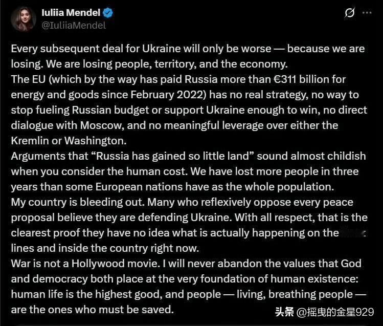 欧盟没有真正的战略,他们的“空头许诺”完全没有意义——乌克兰总统泽连斯基的前新闻秘书:尤利娅·门德尔 建议乌克兰政府接受“28条和平计划”,与俄罗斯达成和平协议。 尤利娅·门德尔发文说,每一次后续与乌克兰的协议都将变得更糟——因为我们正在输,我们正在失去人、领土和经济。 德尔还表示,欧盟没有真正的战略,无法阻止俄罗斯,欧盟没有预算提供资金或向乌克兰提供足够的支持以赢得胜利,欧盟也没有与莫斯科进行直接对话,欧盟对克里姆林宫或华盛顿更没有实质性的影响力。 门德尔称,“当你考虑到人员伤亡的代价时,那些声称“俄罗斯获得的土地如此之少”的说法听上去几乎有些幼稚。我们在三年里失去的人命比某些欧洲国家总人口还多。我们的国家正在流血,许多人对每一项和平提议都本能地反对,他们相信自己在保卫乌克兰。 但恕我直言,这是最明显的证据,表明他们完全不清楚前线和这个国家内部目前的情况。” 门德尔还表示,战争不是好莱坞电影,她永远不会放弃人类存在的价值观——人的生命是最崇高的善,而活生生、有呼吸的人才是必须被拯救的对象。 另外,门德尔在文中还表示,自2022年2月全面开战以来,欧盟向俄罗斯支付了超过3110亿欧元的贸易费用。