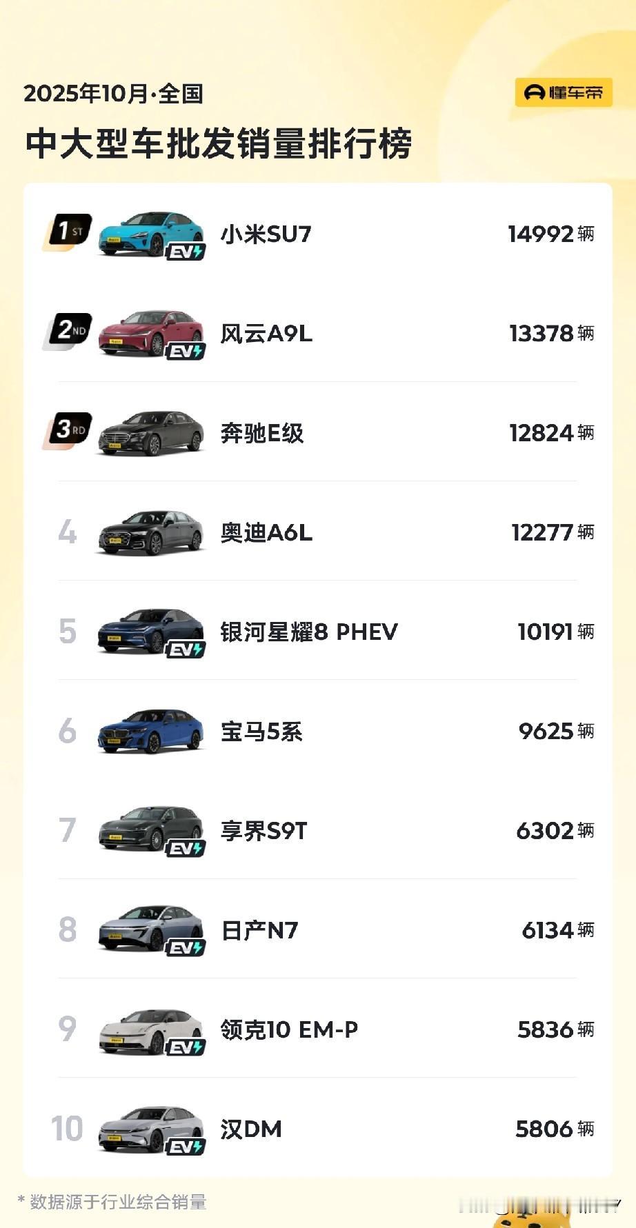 近几日,我频频遇见风云A9L,有时候一天就能邂逅三四台。我心中不免犯起了嘀咕,这似乎不太对劲。这款车上市不过4个月,就算月销1万台,在我们这样的小城市,也不该如此频繁地出现。 于是,我查看了本地的销量榜单,这一看,着实令我大为吃惊。风云A9L竟登上了总榜单,位居第七。上个月,我们这座四五线城市就交付了54辆。 随后,我又查看了中大型轿车总榜单,果不其然,风云A9L已冲进前三,一下子超越了奔驰E和奥迪A6,仅排在小米SU7之后,且差距并不明显。这表现实在是生猛!
