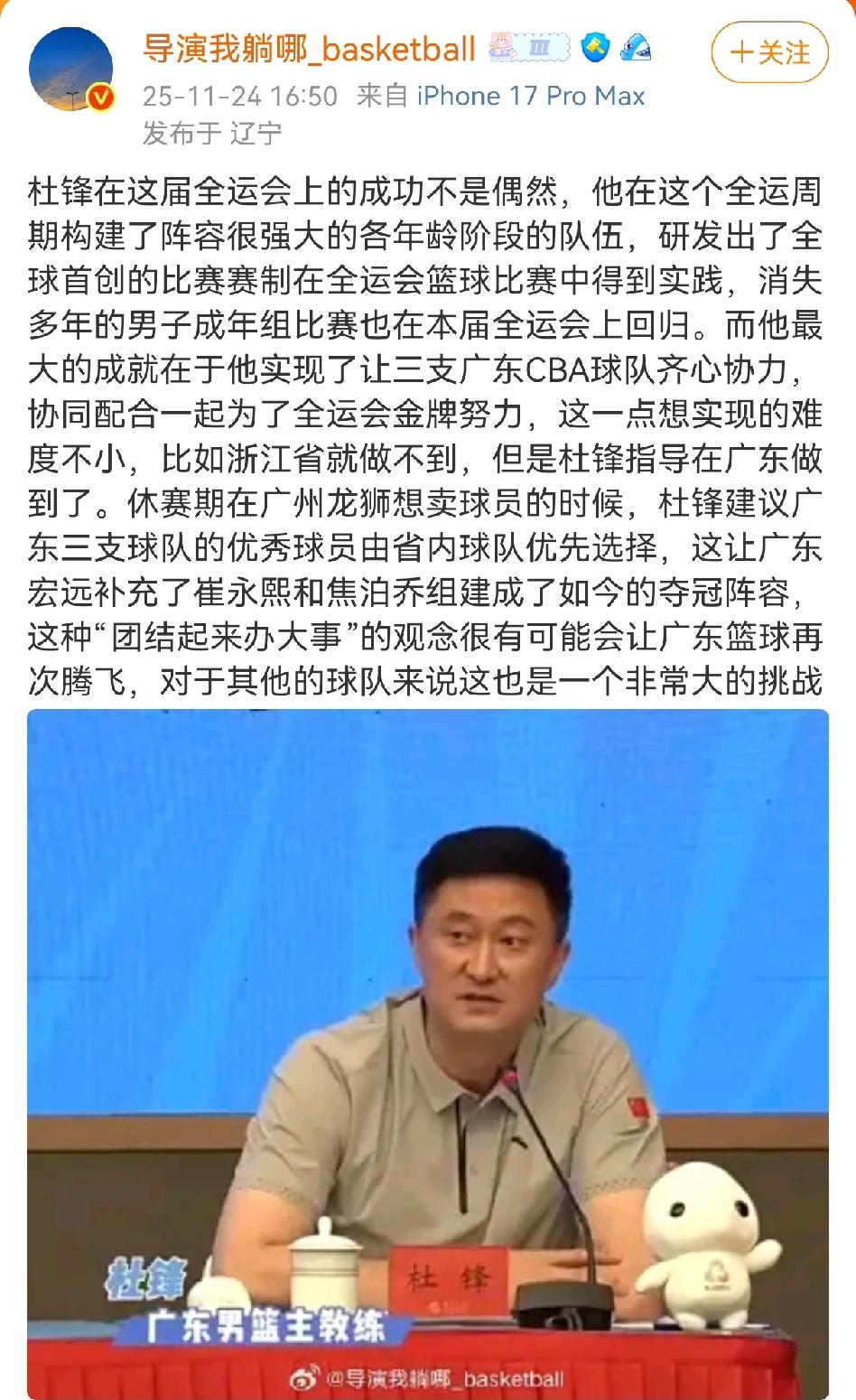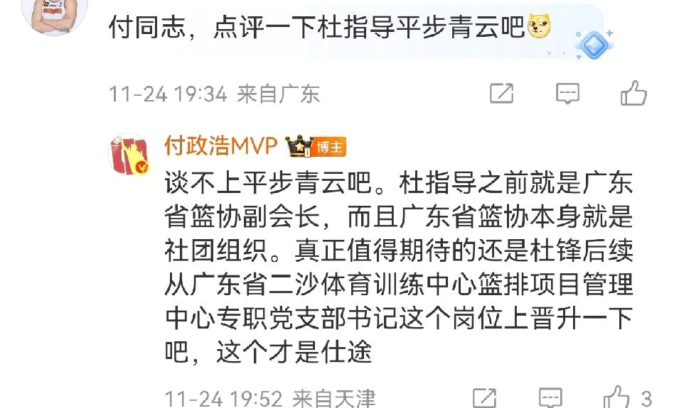 杜锋成为广东篮协书记后,媒体人纷纷这样评论! 丁佳宁说杜锋是最会垮栏的书记,意有调侃杜指导跨栏见领导的行动,语气略显酸涩不够大气。 导演称杜指导把广东三支球队结合起来,在龙狮想要卖球员的时候,建议由省内球队优先选择,还恢复了男子篮球成人组比赛,将杜锋描述成可以上天入地的厉害人物。 付政浩则是另一番观点,他觉得杜锋并不算平步青云,早就是广东省篮协副会长了,并不属于真正的提拔。