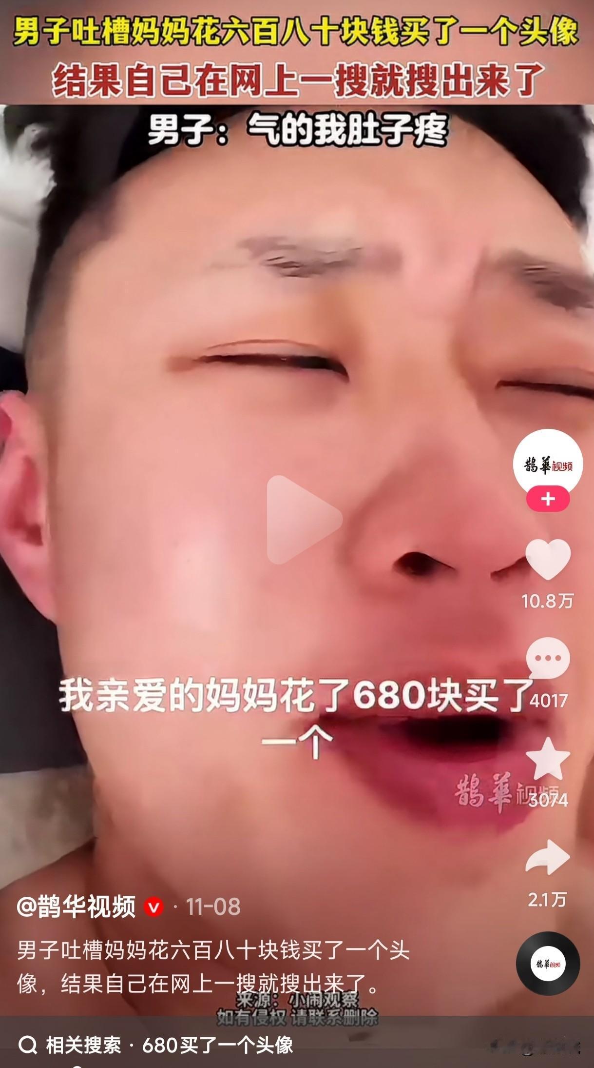 果然还是有钱啥都就有了。 男子吐槽妈妈花680块买了一个头像,结果在网上随便一搜就有的,没想到妈妈花钱去买? 这男子他妈到底是咋想的,究竟是什么样的一个头像居然舍得花680块钱去买,难道是几千年前出土的文物图片吗?还是她小时候见过念念不忘的某个物件? 不得不说买的人是个傻子,这卖的人也就是个骗子,一个愿打一个愿挨,这也就怪不得那方了,最心疼的莫过于这男子了,他可能无论如何都想不通老娘居然花680块买一个图片当头像,这不是妥妥滴冤大头吗?