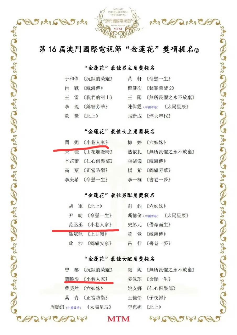 《小巷人家》剧组这操作太迷了 竟然给范丞丞报了最佳男配,给关晓彤报了最佳女配 关晓彤还好说,如果把蒋欣当女主,关晓彤也算是第一女配角了。 就这范丞丞,我都觉得尴尬 首先这个“金莲花”奖真没咋听过, 但是搜了下流程,和其他内地奖大差不差 就是剧组给报名,提供名单,然后组委会在名单里选人,最后宣布谁被提名,谁得奖 按逻辑来说啊,就范丞丞这6G上网速度,不会不知道当年庄图男被骂的多凶吧 以他的智商,更不会不知道一旦被提名,网友会多嘲他吧 所以说,这个奖站在他的立场,应该是不希望自己被提名,反而更想当个透明人才对的。 剧组这操作,感觉关晓彤得奖概率很大,但是有点把范丞丞架火上烤的意思。 其实这部剧,年轻演员里,明显石鹏飞演的最好,不过番位太低估计不好报名,但实在不行,男配报郭晓东也可以吧。